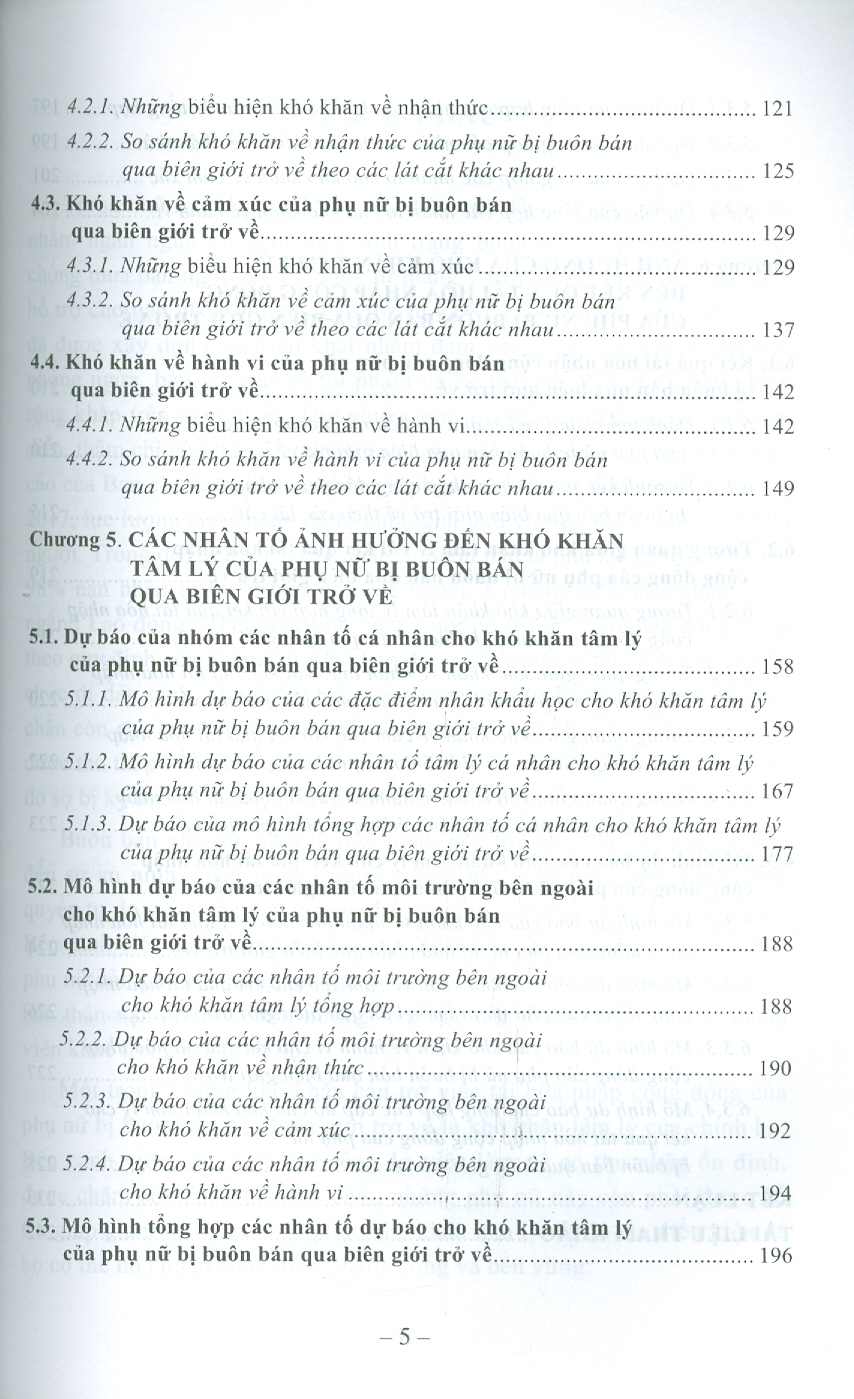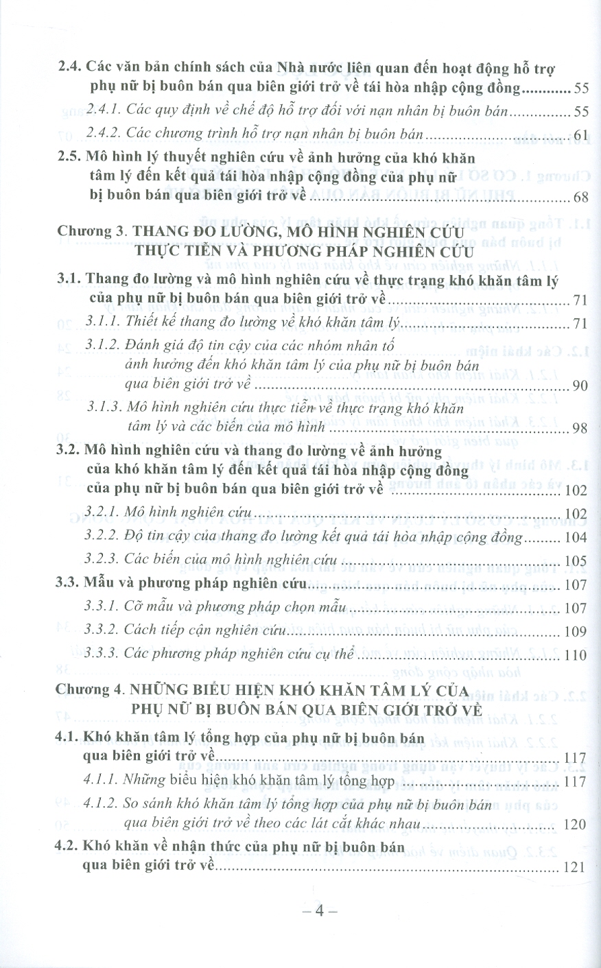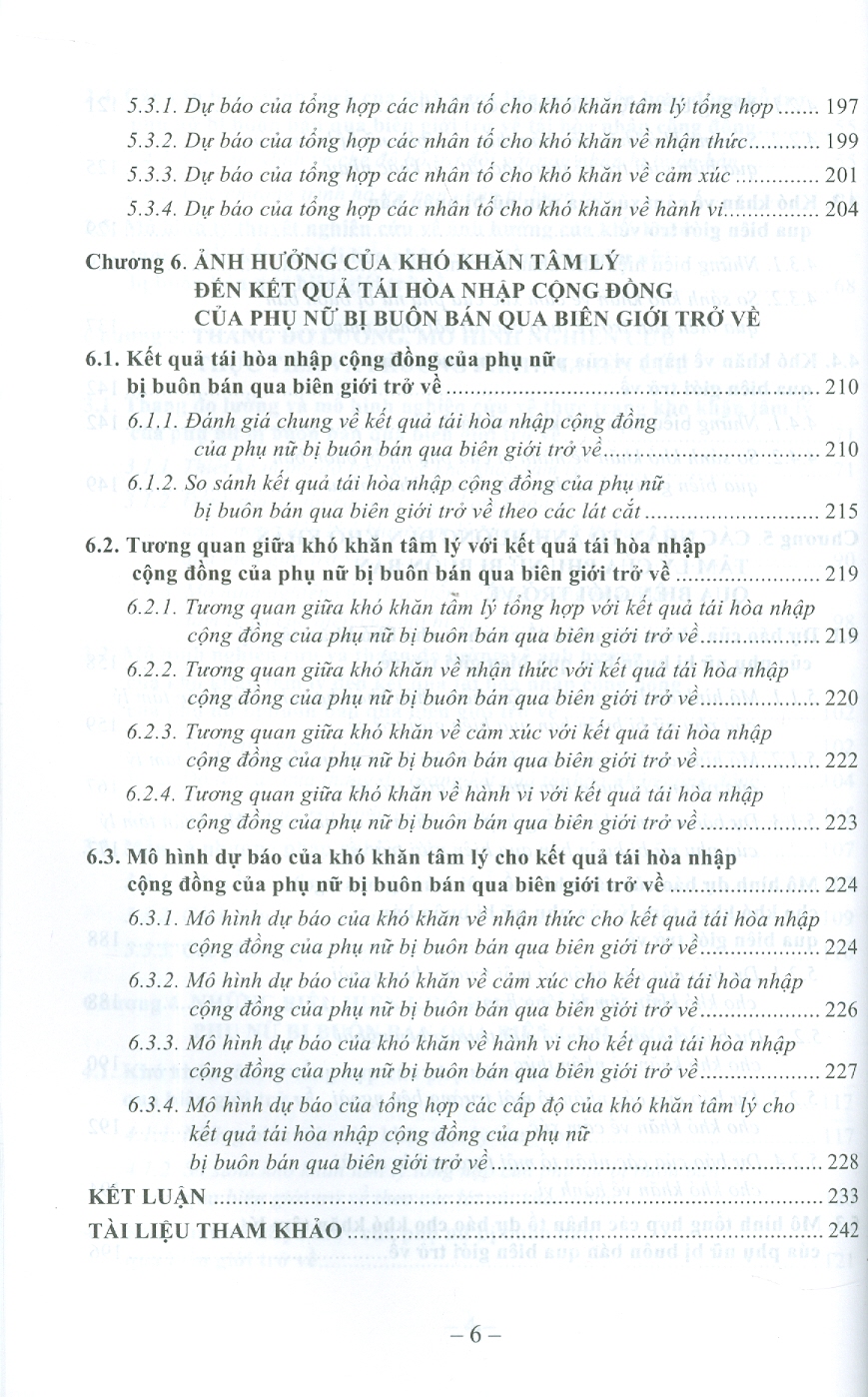 - Chương 6: Ảnh hưởng của khó khăn tâm lý đến kết quả tái hòa nhập cộng đồng của phụ nữ bị buôn bán qua biên giới trở về Cuốn sách này là kết quả đề tài nghiên cứu cơ bản cấp Quốc gia, được tài trợ bởi Quỹ Phát triển Khoa học và Công nghệ Quốc gia.
