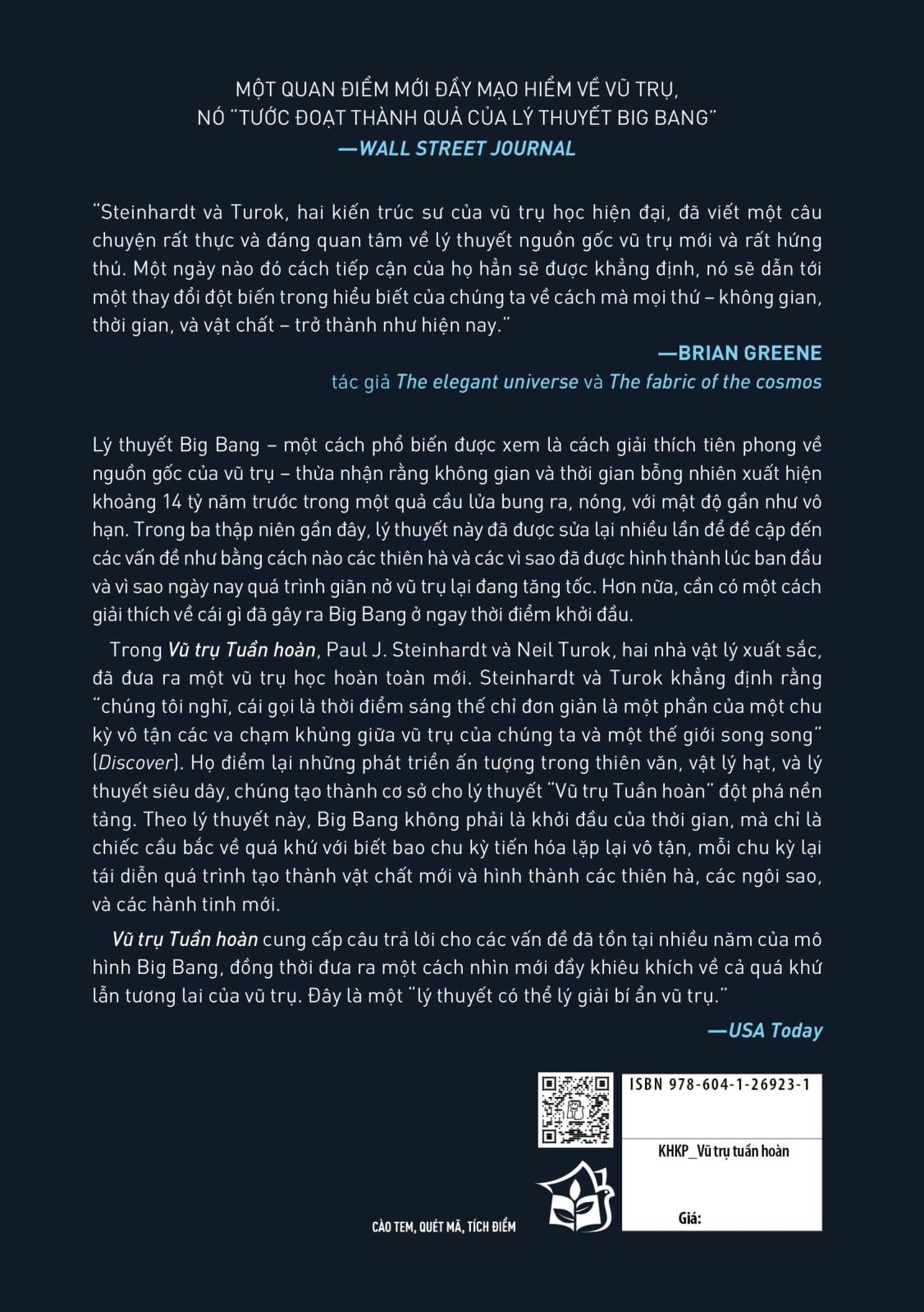 Trong Vũ trụ Tuần hoàn, Paul J. Steinhardt và Neil Turok, hai nhà vật lý xuất sắc, đã đưa ra một vũ trụ học hoàn toàn mới. Steinhardt và Turok “khẳng định rằng chúng tôi nghĩ, cái gọi là thời điểm sáng thế chỉ đơn giản là một phần của một chu kỳ vô tận các va chạm khủng giữa vũ trụ của chúng ta và một thế giới song song"). Họ điểm lại những phát triển ấn tượng trong thiên văn, vật lý hạt, và lý thuyết siêu dây, chúng tạo thành cơ sở cho lý thuyết “Vũ trụ Tuần hoàn” đột phá nền tảng. Theo lý thuyết này, Big Bang không phải là khởi đầu của thời gian, mà chỉ là chiếc cầu bắc về quá khứ với biết bao chu kỳ tiến hóa lặp lại vô tận, mỗi chu kỳ lại tái diễn quá trình tạo thành vật chất mới và hình thành các thiên hà, các ngôi sao, và các hành tinh mới