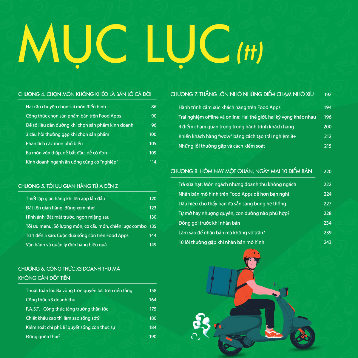 Cuốn sách gồm 8 chương, dẫn dắt người đọc từ tư duy nền tảng đến các kỹ năng thực chiến, giúp bất kỳ ai, kể cả người từng thất bại, có thể khởi nghiệp thành công và làm giàu trên các nền tảng giao đồ ăn như G.r.a.b Food, S.h.o.p.e.e Food…