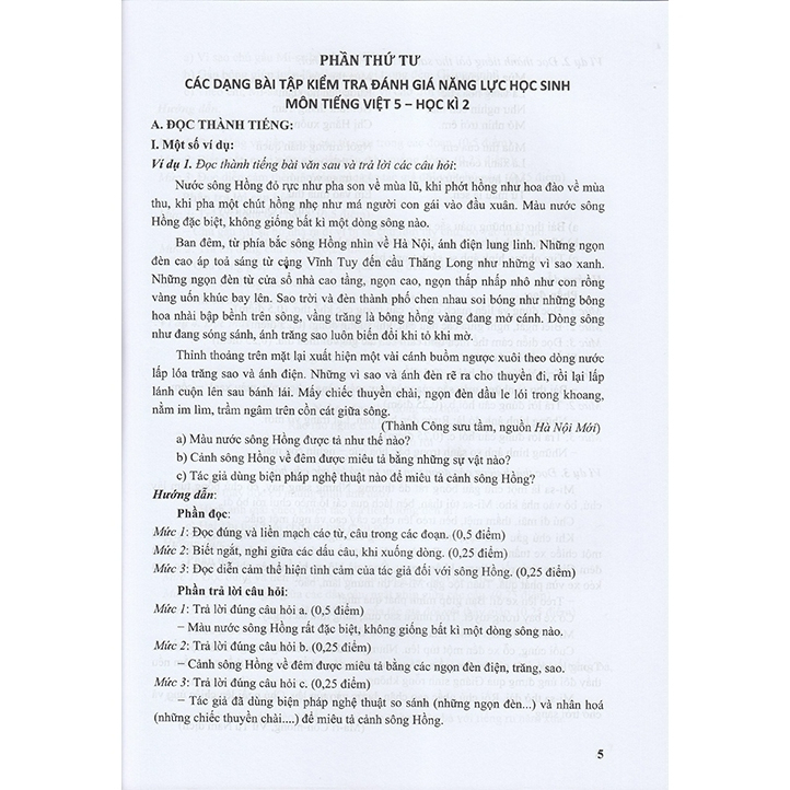 Để giúp giáo viên cũng như các bậc phụ huynh có thêm tài liệu hướng dẫn các em lớp 5 ôn tập trước khi kiểm tra định kì cuối kì và giữa kì, chúng tôi biên soạn cuốn “Kiểm tra, đánh giá năng lực học sinh lớp 5 môn Tiếng Việt”. Cuốn sách sẽ giúp các em ôn tập một cách hiệu quả, đồng thời giúp giáo viên và các bậc phụ huynh đánh giá đúng năng lực của học sinh, từ đó giúp các em điều chỉnh cách học để đạt hiệu quả cao nhất. Cuốn sách gồm 5 phần.