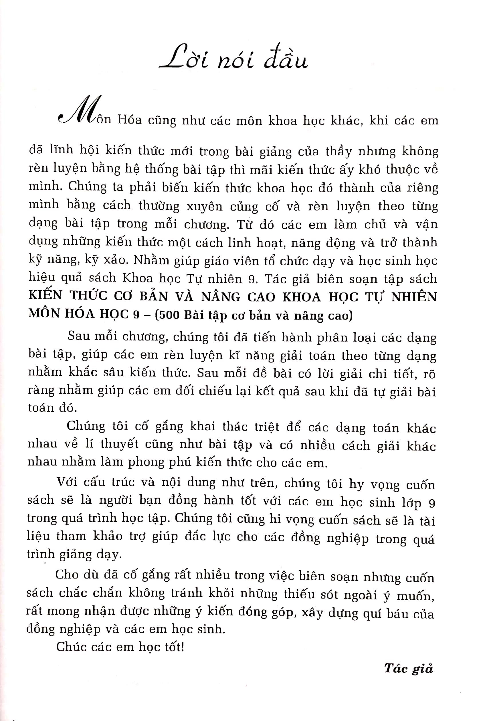 Môn Hóa cũng như các môn khoa học khác, khi các em đã lĩnh hội kiến thức mới trong bài giảng của thầy nhưng không rèn luyện bằng hệ thống bài tập thì mãi kiến thức ấy khó thuộc về m.ình. Chúng ta phải biến kiến thức khoa học đó thành của riêng m.ình bằng cách thường xuyên củng cố và rèn luyện theo từng dạng bài tập trong mỗi chương. Từ đó các em làm chủ và vận dụng những kiến thức một cách linh hoạt, năng động và trở thành kỹ năng, kỹ xảo. Nhằm giúp giáo viên tổ chức dạy và học sinh học hiệu quả sách Khoa học Tự nhiên 9. Tác giả biên soạn tập sách KIẾN THỨC CƠ BẢN VÀ NÂNG CAO KHOA HỌC TỰ NHIÊN MÔN HÓA HỌC 9 – (500 Bài tập cơ bản và nâng cao)
