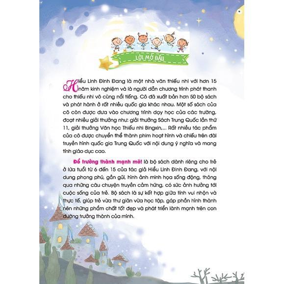 Trưởng thành là quãng thời gian tươi đẹp nhất của cuộc đời , đây là giai đoạn quan trọng để trẻ gieo mầm những thói quen tốt , phát triển suy nghĩ , tính cách ; cũng là thời điểm bố mẹ cần lắng nghe và chia sẻ với con cái nhiều hơn về các vấn đề trong cuộc sống . Đồng hành cùng trẻ trên con đường trưởng thành thần kỳ ấy , bộ sách "Để trường thành mạnh mẽ!" của nhà văn thiếu nhi nổi tiếng Hiểu Linh Đinh Đang với hơn 15 năm kinh nghiệm và đoạt rất nhiều giải thưởng văn học thiếu nhi nổi bật , sẽ mang đến cho trẻ những câu chuyện mới mẻ , thú vị cùng bài học ý nghĩa về : sự tự lập , tình yêu thương , biết cách lắng nghe , chia sẻ , ... Từ đó , giúp trẻ hình thành những kỹ năng sống lành mạnh và phẩm chất tốt đẹp để vững bước trên con đường của mình .