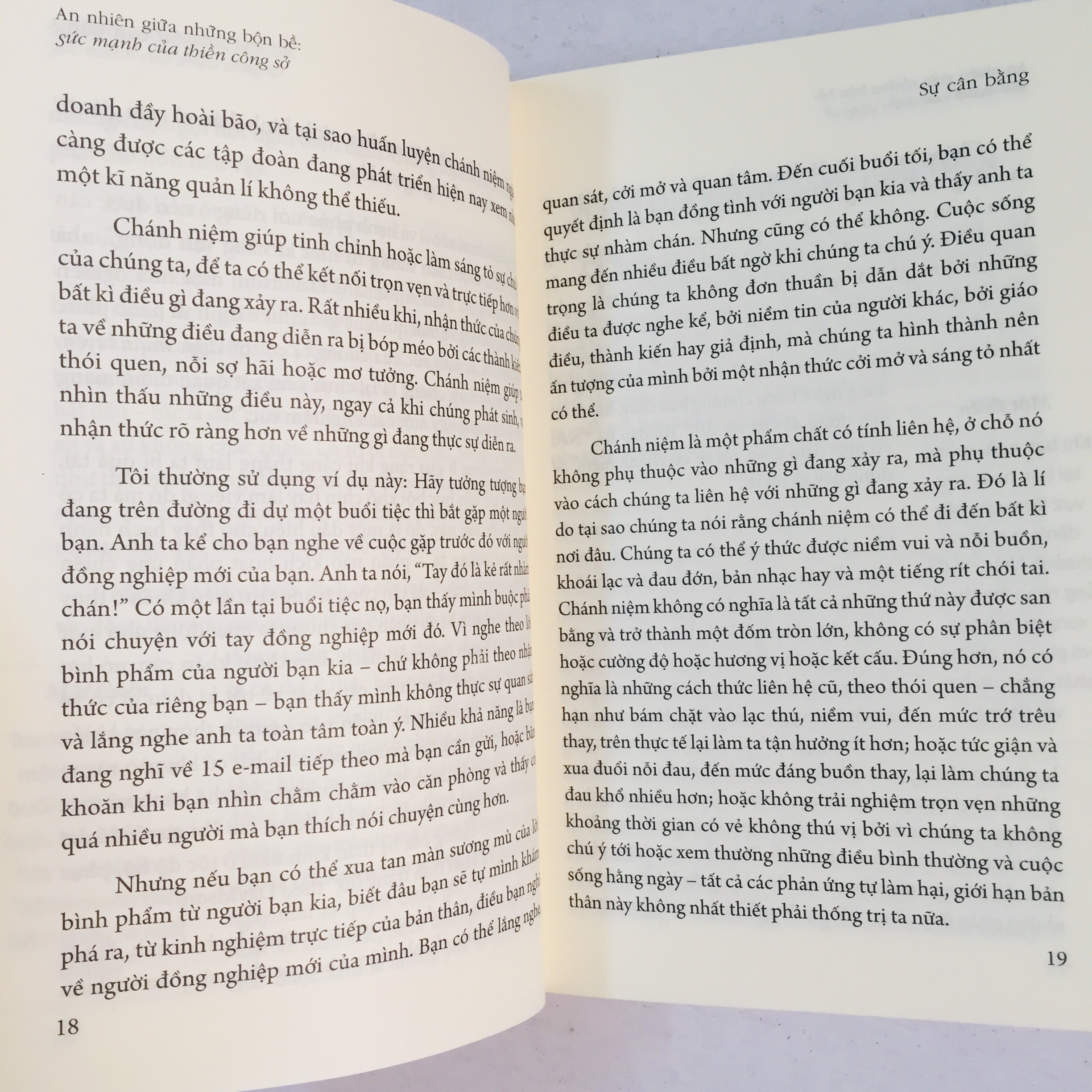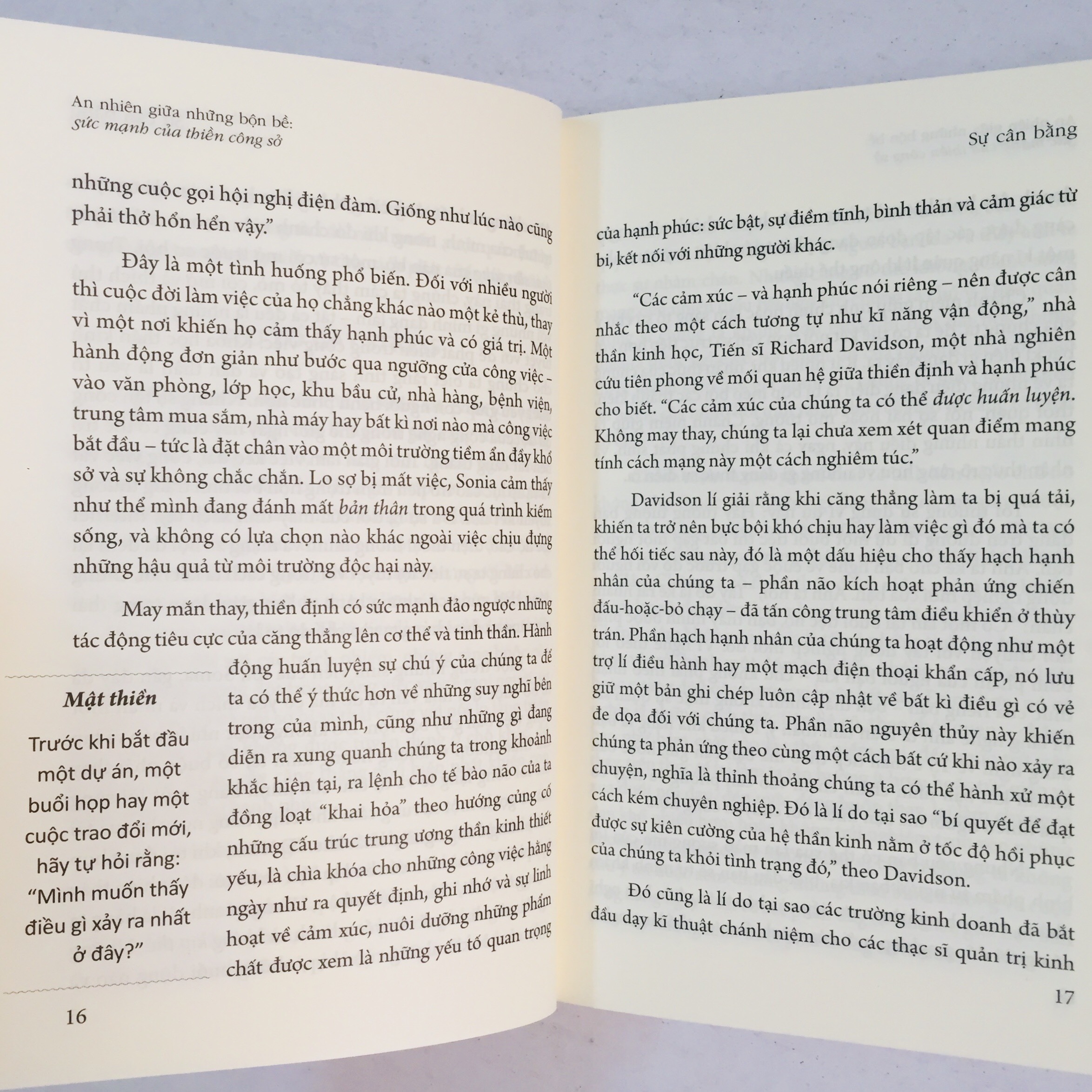 Cuốn sách này sẽ giúp bạn làm được điều đó. Nó hướng dẫn bạn cách nuôi dưỡng chánh niệm, lòng từ bi và khả năng nhận thức, rồi gắn kết những điều đó với không gian làm việc của bản thân. Nó cho ta biết cách cam kết mà không bị choáng ngợp; cách duy trì sự cạnh tranh mà không tỏ ra tàn nhẫn; cách quản lí thời gian và cảm xúc để đối phó với căng thẳng và bực bội.