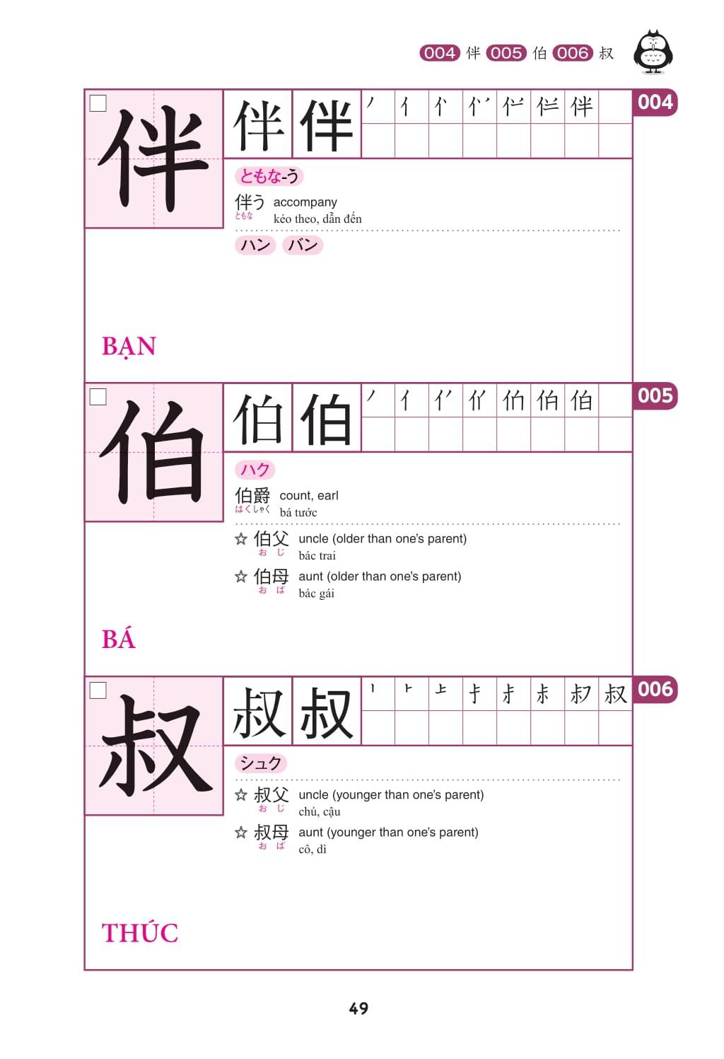 - Các Hán tự được sắp xếp theo cùng một bộ chữ tương tự, giúp nhận ra sự khác biệt và hình dung ra hình dạng của mỗi chữ Hán tự hơn.