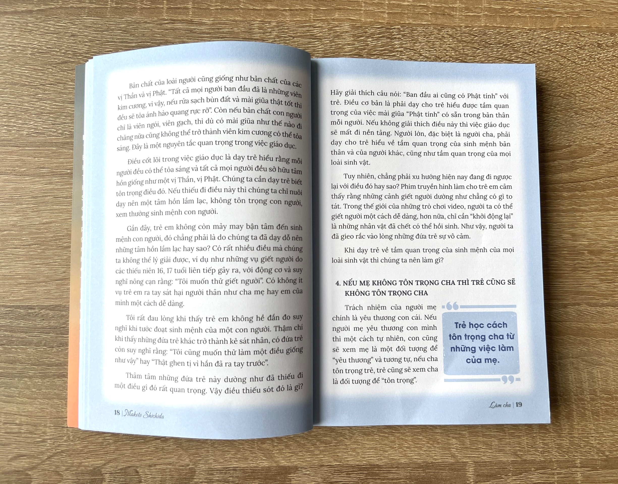 Mua tại TiktokCuốn sách như một bản tóm tắt và thuyết trình chuẩn mực cho các ông bố bận rộn với trăm ngàn lý do khác nhau để thay đổi cách nhìn nhận của họ về vai trò của người làm cha. Sự thay đổi cách nhìn nhận của người cha và sự tham gia tích cực hơn trong việc nuôi dạy con có thể đạt được kết quả ngay tức khắc, chứ không cần phải "chờ con lớn hơn chút nữa". (Theo Viện giáo dục Shichida Việt Nam)