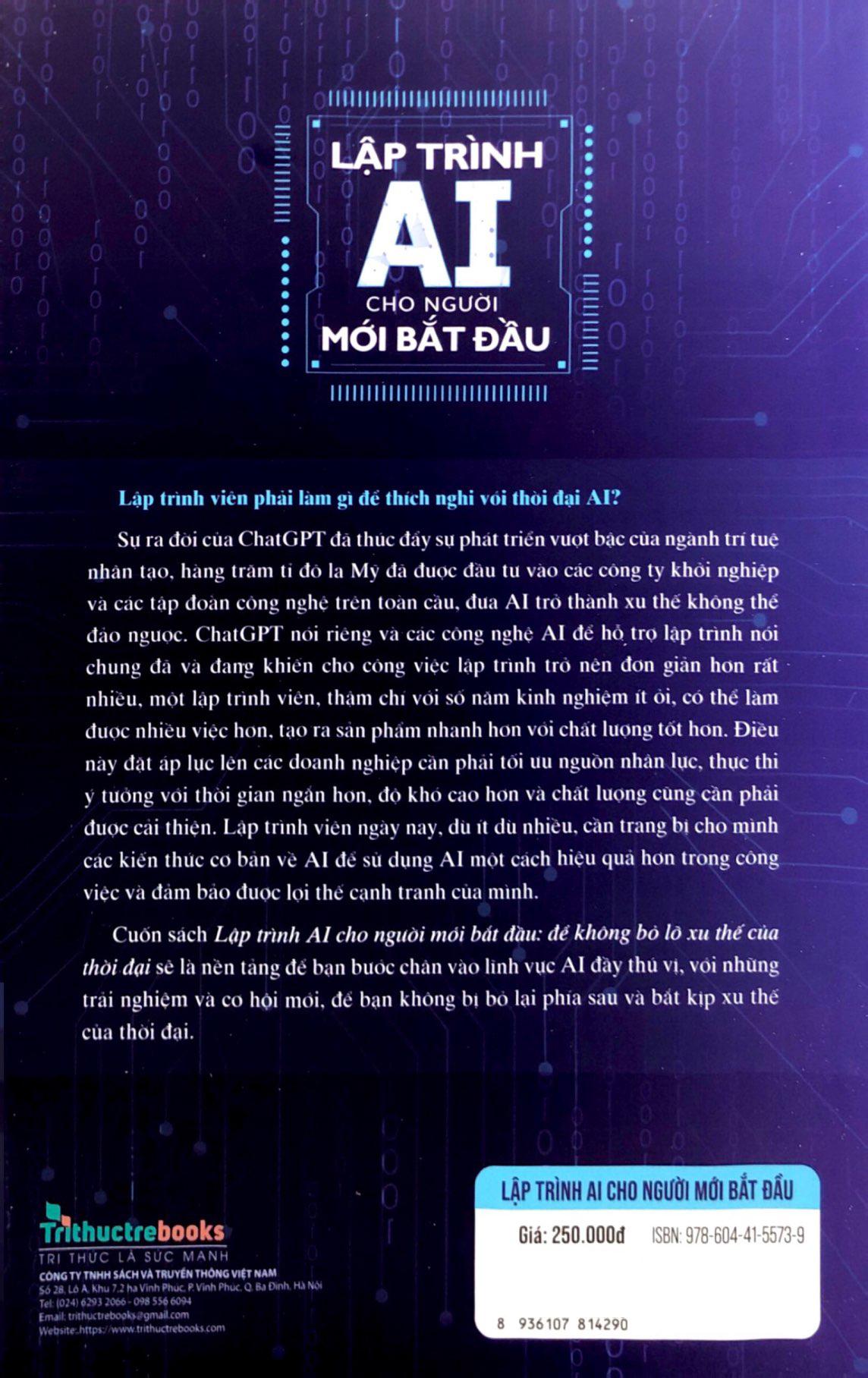 Cuốn sách Lập trình AI cho người mới bắt đầu ra đời nhằm đáp ứng nhu cầu đó. Cuốn sách sẽ giúp các lập trình viên từ mọi trình độ nhanh chóng nắm vững những kiến thức cốt lõi để có thể tự tin khám phá và ứng dụng AI vào công việc của m.ình.
