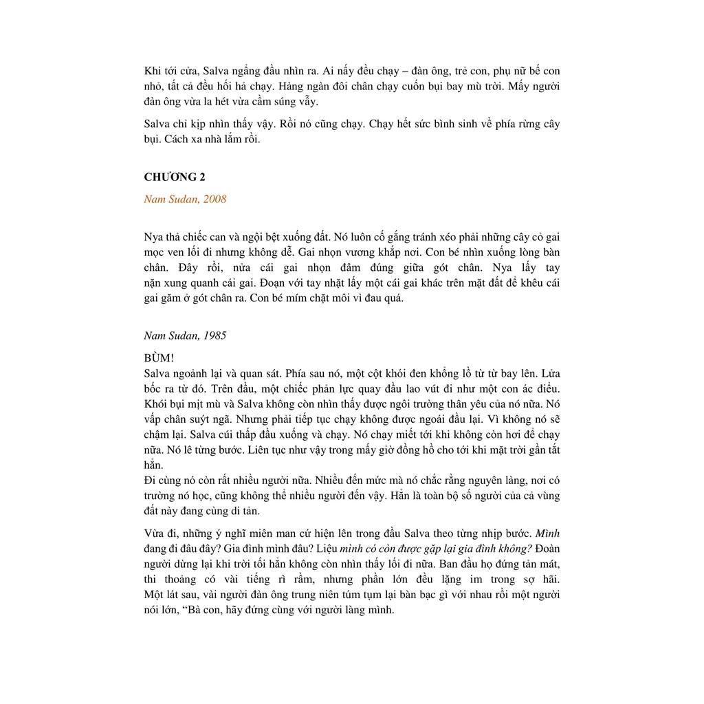 nữa. Nó lê từng bước. Liên tục như vậy trong mấy giờ đồng hồ cho tới khi mặt trời gần tắt hẳn. Đi cùng nó còn rất nhiều người nữa. Nhiều đến mức mà nó chắc rằng nguyên làng, nơi có trường nó học, cũng không thể nhiều người đến vậy. Hẳn là toàn bộ số người của cả vùng đất này đang cùng di tản. Vừa đi, những ý nghĩ miên man cứ hiện lên trong đầu Salva theo từng nhịp bước. Mình đang đi đâu đây? Gia đình mình đâu? Liệu mình có còn đượcgặp lại gia đình không?Đoàn người dừng lại khi trời tối hẳn không còn nhìn thấy lối đi nữa. Ban đầu họ đứng tản mát, thi thoảng có vài tiếng rì rầm, nhưng phần lớn đều lặng im trong sợ hãi.