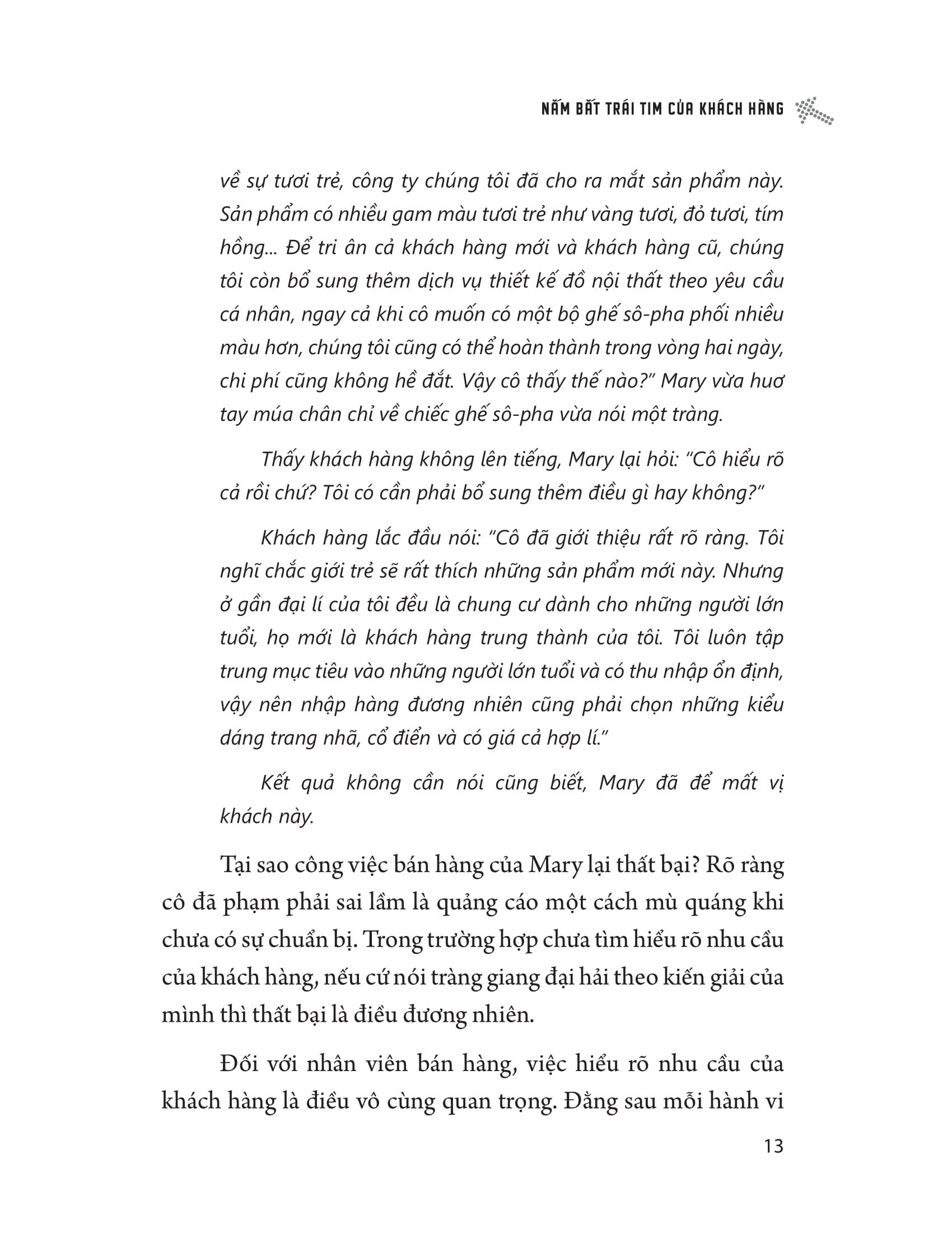 Cuốn sáchLời nói chạm đến tim khách hàngđưa ra rất nhiều ví dụ bán hàng thực tế để giải mã những lời khuyên của các bậc thầy bán hàng trong cách nói chuyện và đám phán cho những người sắp tham gia hoặc hiện đang tham gia vào công việc bán hàng. Bên cạnh đó, cuốn sách cung cấp những phương pháp thực tế và cụ thể để hướng dẫn mọi người cách vận dụng những lời khuyên này, từ đó nắm vững kĩ năng bán hàng xuất sắc!