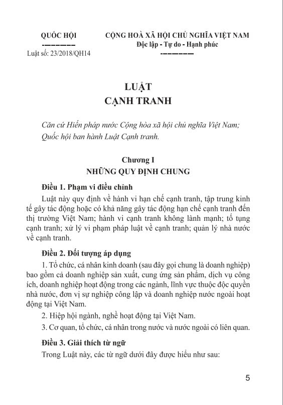 Tác Giả: Nhiều Tác Giả Nhà cung cấp ndbooks Nhà Xuất Bản: Nhà Xuất Bản Lao Động Năm Xuất Bản: 2025 Kích Thước: 14.5 x 20.5 cm Loại Bìa: Bìa Mềm Số Trang: 76 Trọng Lượng: 300g QUỐC HỘI Luật số: 23/2018/QH14 CỘNG HOÀ XÃ HỘI CHỦ NGHĨA VIỆT NAM Độc lập – Tự do - Hạnh phúc LUẬT CẠNH TRANH Căn cứ Hiến pháp nước Cộng hòa xã hội chủ nghĩa Việt Nam; Quốc hội ban hành Luật Cạnh tranh. Chương I NHỮNG QUY ĐỊNH CHUNG Điều 1. Phạm vi điều chỉnh Luật này quy định về hành vi hạn chế cạnh tranh, tập trung kinh tế gây tác động hoặc có khả năng gây tác động hạn chế cạnh tranh đến thị trường Việt Nam; hành vi cạnh tranh không lành mạnh; tố tụng cạnh tranh; xử lý vi phạm pháp luật về cạnh tranh; quản lý nhà nước về cạnh tranh. Điều 2. Đối tượng áp dụng