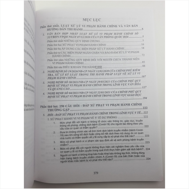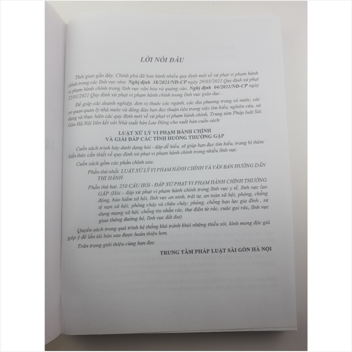 - Toàn bộ sách bìa mềm khổ lớn 20 x 28 cm phân phối bởi Nhà sách Nam Việt đều được bọc sách Plastic MIỄN PHÍ và xuất hóa đơn điện tử đầy đủ, nhanh chóng. Nội dung sách gồm 2 phần: Phần thứ nhất. LUẬT XỬ LÝ VI PHẠM HÀNH CHÍNH VÀ VĂN BẢN HƯỚNG DẪN THI HÀNH Phần thứ hai. 250 CÂU HỎI - ĐÁP XỬ PHẠT VI PHẠM HÀNH CHÍNH THƯỜNG GẶP (Hỏi - đáp xử phạt vi phạm hành chính trong lĩnh vực y tế, lĩnh vực lao động, bảo hiểm xã hội, lĩnh vực an ninh, trật tự, an toàn xã hội; phòng, chống tệ nạn xã hội; phòng cháy và chữa cháy; phòng, chống bạo lực gia đình, sử dụng mạng xã hội, chống tin nhắn rác, thư điện tử rác, cuộc gọi rác, lĩnh vực giao thông đường bộ, lĩnh vực đất đai) Cảm ơn các bạn đã ghé thăm shop Nhà sách Nam Việt rất nhiều ạ!