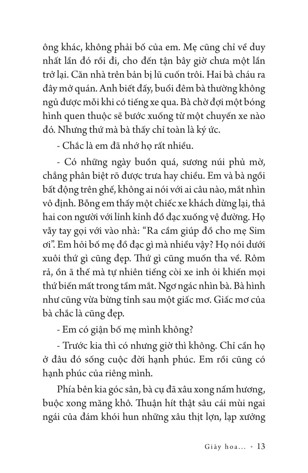 Tập truyện gồm các truyện ngắn: Giày hoa, Những khuôn mặt tượng, Kẻ dịch chuyển, Bụi đất, Gùi xuân lên đỉnh mây trời, Gió từ đỉnh núi, Tại sao im lặng?, Bên lề ký ức, Thả quỷ,...