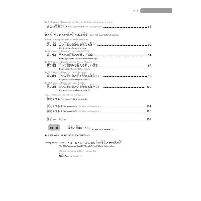 Đứng trên quan điểm đó, quyển sách này chia các chữ Hán cần học thành năm phần và mỗi dạng bài tập cũng sẽ thay đổi tùy theo từng phần. Do đó, các bạn sẽ học một cách hiệu quả hơn và trang bị cho mình những kiến thức về hệ thống chữ của tiếng Nhật. Hiện nay số người học tiếng Nhật đến từ các quốc gia không sử dụng chữ Hán đang tăng lên. Trên cơ sở đó, để cho các bạn dễ hiểu các nét viết của những chữ Hán, quyển sách này những chữ Hán lớn, đồng thời đưa ra các vấn đề cần chú ý tới cấu tạo của chữ Hán. Ngoài ra để bổ trợ cho việc tự học của các bạn, ngoài các chữ Hán trong từng bài khóa còn có thêm phần tổng hợp list từ vựng và chữ Hán của mức độ N3 đi kèm với phần dịch tiếng Anh và tiếng Trung.