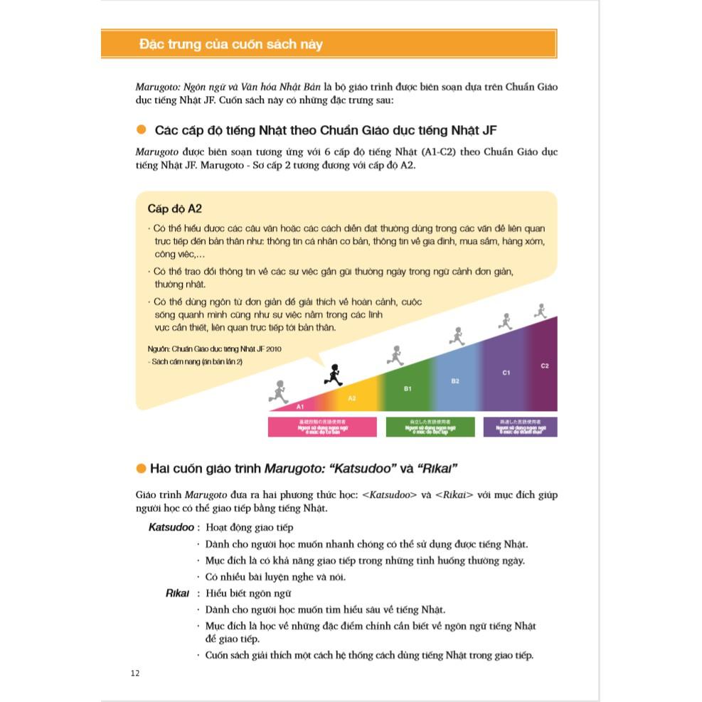 Tác giả: The Japan Foundation NXB: NXB Đại học Quốc Gia Thành Phố Hồ Chí Minh Công ty phát hành: First News - Trí Việt Số trang: 188 Kích thước: 20.5 x 28.5 cm Năm xuất bản: 2020 Loại Bìa: Bìa mềm Mô tả sản phẩm: Ngay sau khi ra mắt bộ giáo trình Marugoto A2 Sơ cấp 1, First News – Trí Việt tiếp tục phát hành Marugoto A2 Sơ cấp 2 giúp người đọc nâng cao trình độ giao tiếp tiếng Nhật. Marugoto là một giáo trình công phu và đầy tâm huyết của Nhật Bản với mong muốn phổ cập và nâng cao tiếng Nhật cho người nước ngoài ở khắp thế giới. Giáo trình được triển khai dựa trên Chuẩn Giáo dục tiếng Nhật JF. Tựa đề Marugoto, có nghĩa là “trọn vẹn”, đó cũng chính là thông điệp mà Quỹ Giao lưu Quốc tế Nhật Bản muốn gửi đến quý độc giả: sự kết hợp hài hòa giữa ngôn ngữ và văn hóa. Giáo trình này giới thiệu những tình huống giao tiếp thực tế, giúp người học trải nghiệm nhiều khía cạnh đa dạng của văn hóa Nhật Bản và đặc trưng trong đời sống của người Nhật một cách trọn vẹn. Cấp độ A2 thuộc mức độ sơ cấp và trình độ A2-2 là trình độ nâng cao hơn sau khi bạn đã học qua A2-1. Tương tự với những cuốn Marugoto trước đó, Marugoto - Ngôn ngữ và Văn hóa Nhật Bản A2-2 cũng được chia làm 2 quyển “Katsudoo” (Hoạt động giao tiếp) và “Rikai” (Hiểu biết ngôn ngữ). Qua đó có thể giúp người học lựa chọn được phương pháp sử dụng giáo trình tùy theo nhu cầu và cách học của mình. Giáo trình này có những điểm đặc trưng sau: Giáo trình Marugoto Rikai - Hiểu biết ngôn ngữ được xây dựng với trọng tâm là các kiến thức ngôn ngữ (chữ viết, từ vựng, ngữ pháp,…) để bổ trợ cho hoạt động giao tiếp. Giáo trình Marugoto Katsudoo - Hoạt động giao tiếp được xây dựng với trọng tâm là các hoạt động giao tiếp ngôn ngữ. Xây dựng tình huống gồm những nhân vật thuộc nhiều nền văn hóa khác nhau dựa trên tinh thần hiểu biết và tôn trọng sự khác biệt về văn hóa để giao tiếp với nhau bằng tiếng Nhật. Thiết kế những bài thực hành giúp người học làm quen với những đoạn hội thoại mang ngữ cảnh tự nhiên nhằm trau dồi ngôn ngữ thông qua nghe hiểu. Áp dụng phương pháp sử dụng hồ sơ năng lực cá nhân để quản lý việc tự học. Cung cấp miễn phí các dữ liệu âm thanh : và rất nhiều các tài liệu miễn phí khác như danh sách từ vựng, tài liệu hỗ trợ giảng dạy dành cho các giáo viên sử dụng Marugoto trên trang