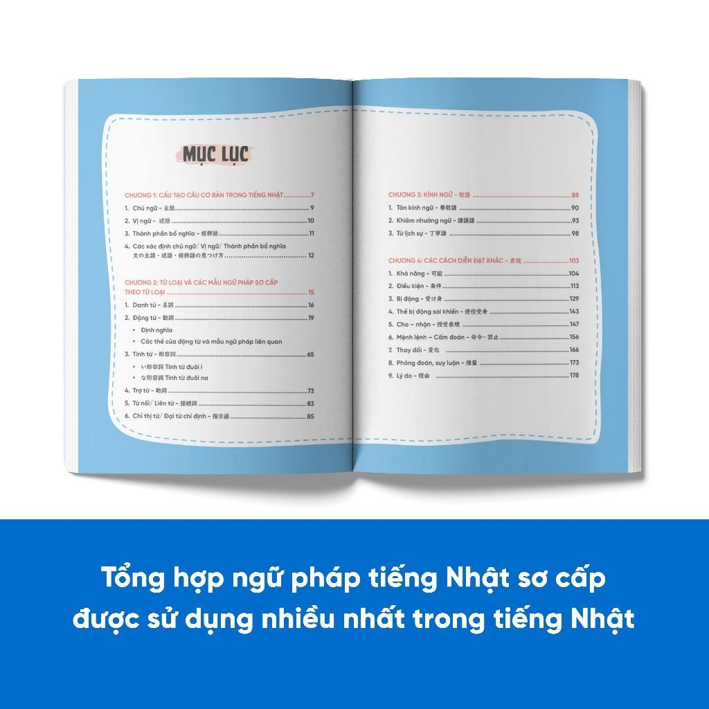 Cuốn sách tổng hợp một cách hệ thống các ngữ pháp sơ cấp giúp người học dễ dàng nắm bắt và được cung cấp đầy đủ về ý nghĩa, cách chia cùng với ví dụ minh họa sinh động. Việc hệ thống các mẫu ngữ pháp dưới dạng sơ đồ tư duy – mindmap giúp người học dễ nhớ cũng như vận dụng vào các bài tập luyện tập hay như kỳ thi JLPT.