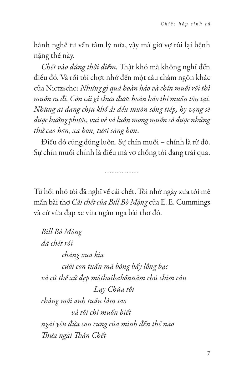 Bản thân ta còn có thể thức dậy hôm nay, nghĩa là ta đã sở hữu điều kiện cơ bản để được hạnh phúc. Nhưng giữa guồng quay cuộc sống bộn bề, ta chỉ mải chú tâm vào được và mất, mong cầu và phiền não, mà quên rằng sự sống vốn là món quà vô giá, lẽ ra phải được trân quý bằng cả trái tim. Hiếm lời khuyên nào có sức lay động mạnh mẽ hơn chính những câu từ bình thản và đầy trải nghiệm, viết từ chặng cuối đời người. Câu chuyện tình yêu bền bỉ tháng năm của vợ chồng Yalom sẽ tiếp thêm động lực để ta yêu thương và hy vọng vào cuộc sống, kể cả trong tháng ngày khó khăn vô định. Khi cầm quyển sách trên tay, là ta đã sẵn sàng cho sự chuyển hóa tích cực và cần thiết đối với bất kỳ ai.