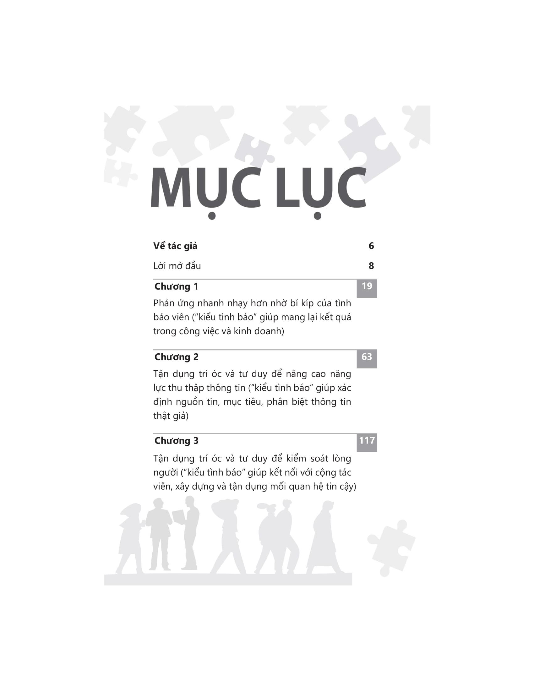 Các điệp viên tình báo, hay còn gọi là tình báo viên, được coi là lực lượng tinh nhuệ hàng đầu. Họ được đào tạo, huấn luyện và rèn giũa để có thể hoàn thành những nhiệm vụ gian khổ, khó nhằn nhất một cách bình tĩnh và nhanh chóng, dù trong bất kỳ điều kiện, hoàn cảnh nào. Họ đã làm điều đó bằng cách nào? Những kỹ thuật của họ tài tình ra sao? Chúng có liên quan gì đến công việc kinh doanh ngoài thực tế? Câu trả lời đều có trong cuốn sách này.