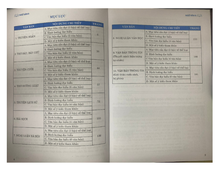 Cuốn sách gồm 10 đơn vị bài ứng với 10 thể loại/tiểu loại (đọc hiểu) của chương trình Ngữ văn 8 thuộc 3 kiểu văn bản chính.