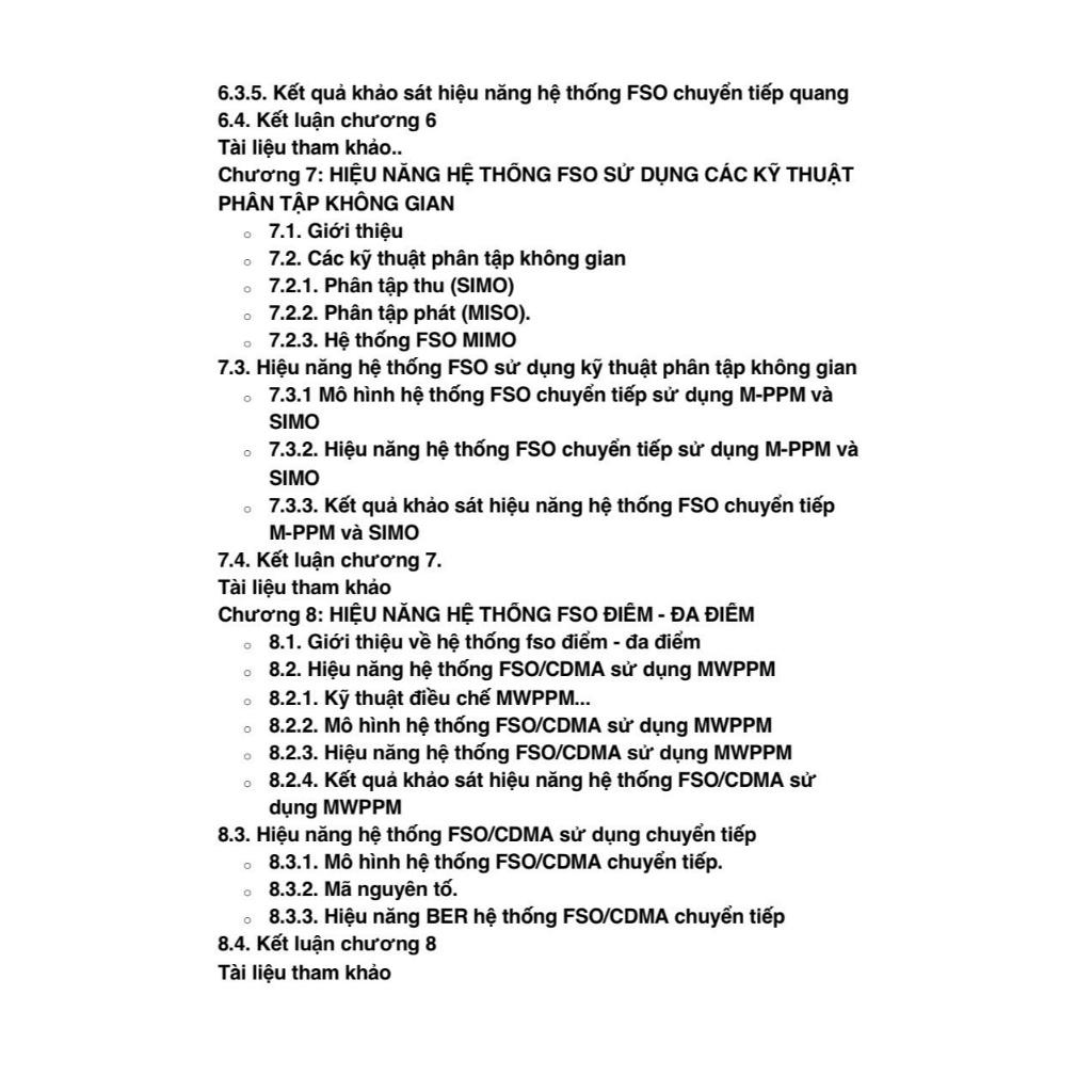 Cuốn sách này nhằm cung cấp những kiến thức cơ bản về mô hình kên truyền khí quyển và hiệu năng của các hệ thống truyền thông quang không dây FSO. Ngoài ra sách còn cung cấp các kiến thức nâng cao về áp dụng các kỹ thuật xử lý tín hiệu tiên tiến nhằm cải thiện hiệu năng hệ thống SFO, bao gồm : các kỹ thuật điều chế đa mức / trạng thái, kỹ thuật chuyển tiếp điện / quang, kỹ thuật phân tập không gian và đa truy cập cho hệ thống FSO điểm - đa điểm.