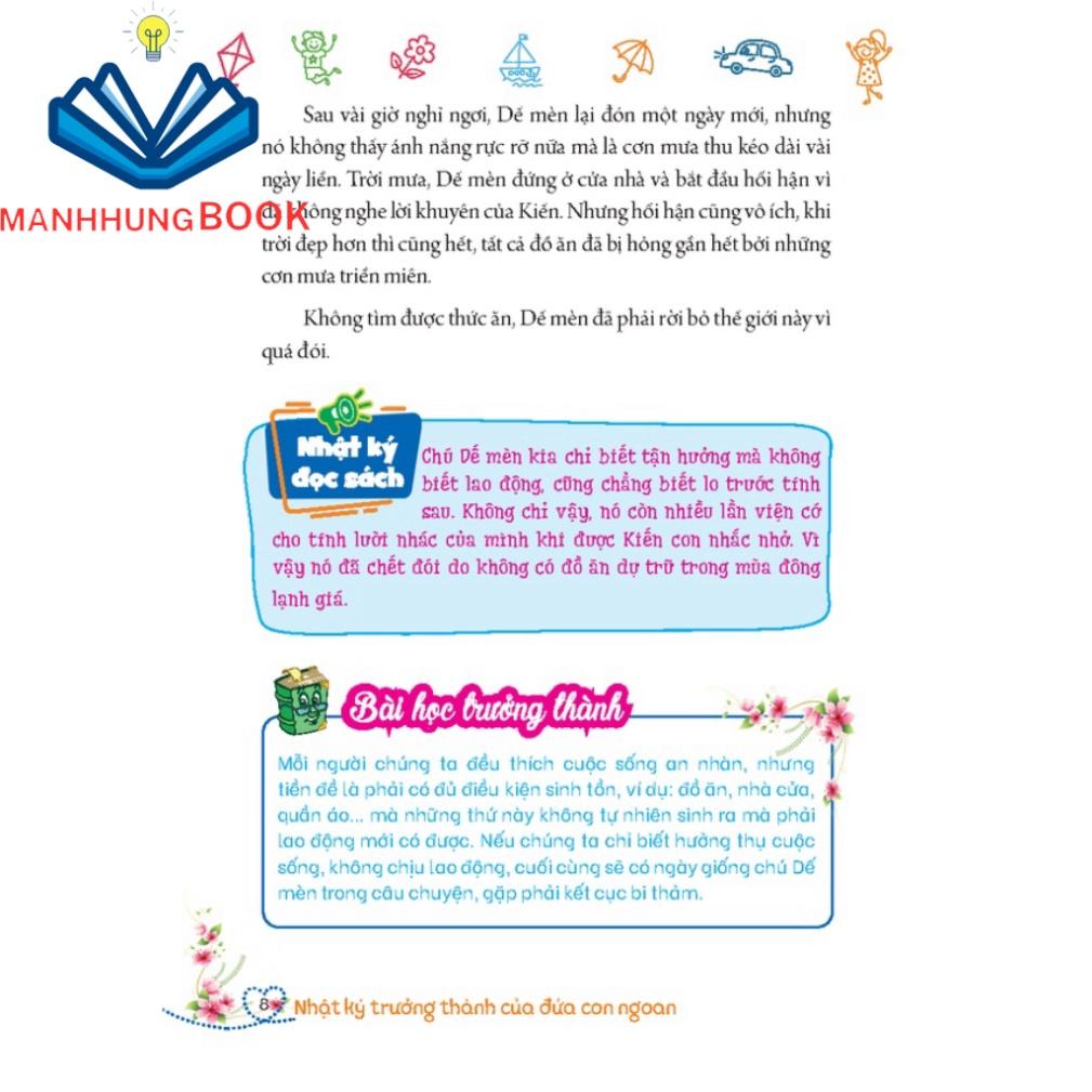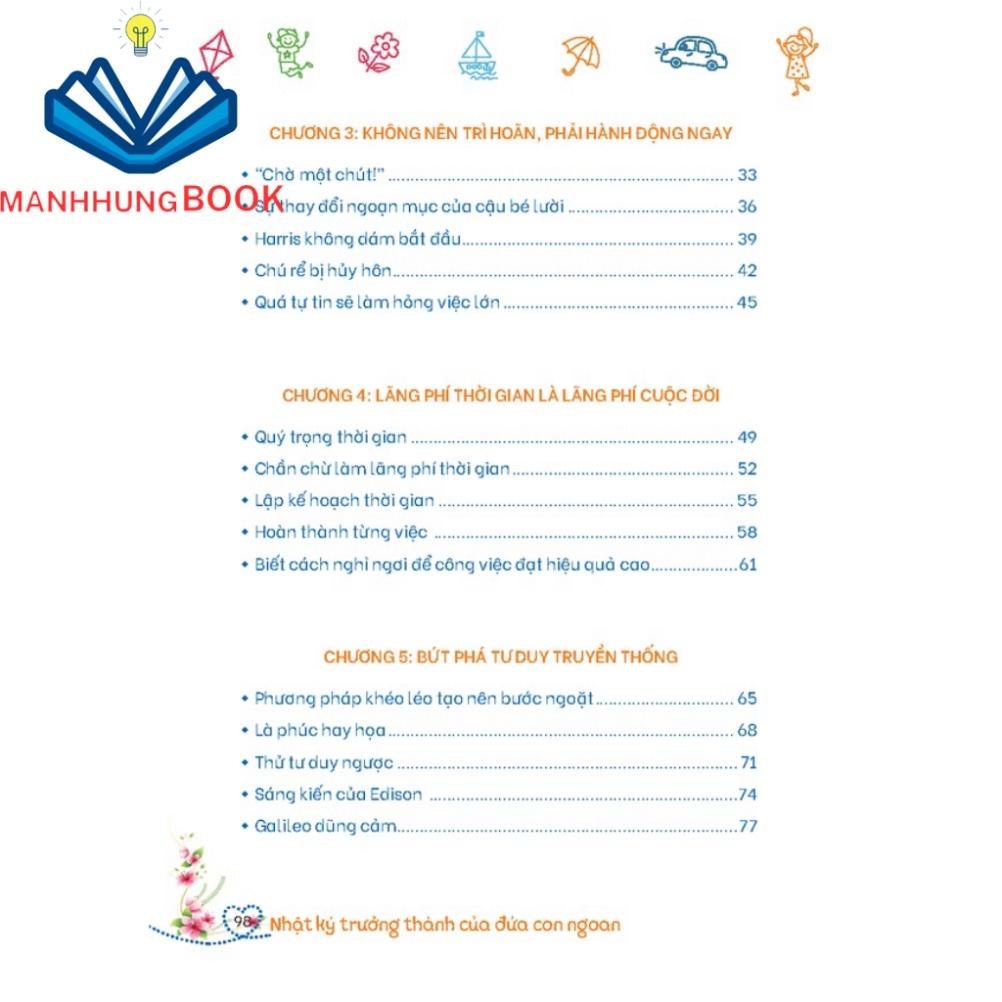 Bộ sách Nhật ký trưởng thành của đứa con ngoan là sách kỹ năng sống dành cho học sinh từ 6 đến 12 tuổi được biên soạn gồm những câu chuyện quen thuộc , gần gũi góp phần truyền tải thông điệp ý nghĩa đến trẻ : Khi khó khăn sẽ luôn có biện pháp khắc phục ; học tập tuy vất vả nhưng úng rất vui ; nếu gặp chuyện mình có thể làm tốt thi phải chủ động xung phong