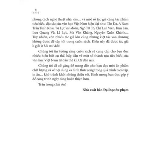 Chúng tôi tin tưởng rằng đọc cuốn sách này, bạn đọc sẽ có thêm nhiều hiểu biết cụ thể, hấp dẫn về một số thành tựu tiêu biểu của văn học Việt Nam từ đầu thế kỉ XX đến nay – thời kì văn học Việt Nam phát triển theo hướng hiện đại hoá với nhịp độ phát triển mau lẹ, đạt nhiều thành tựu rực rỡ.