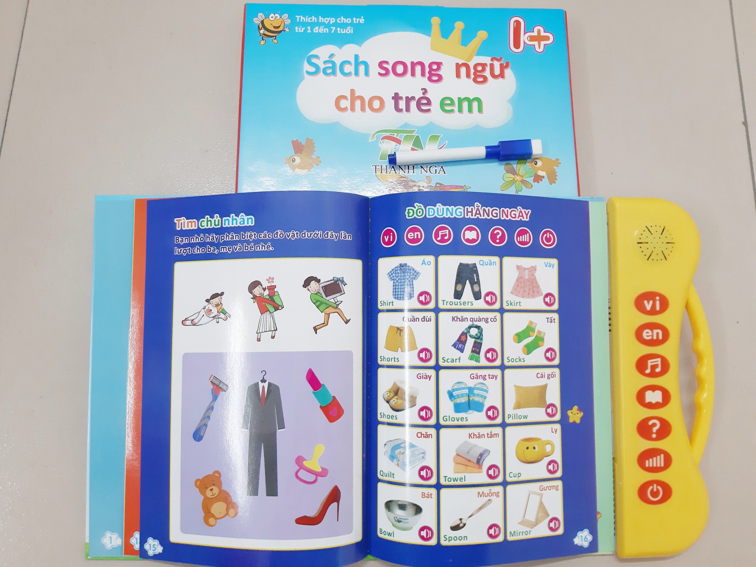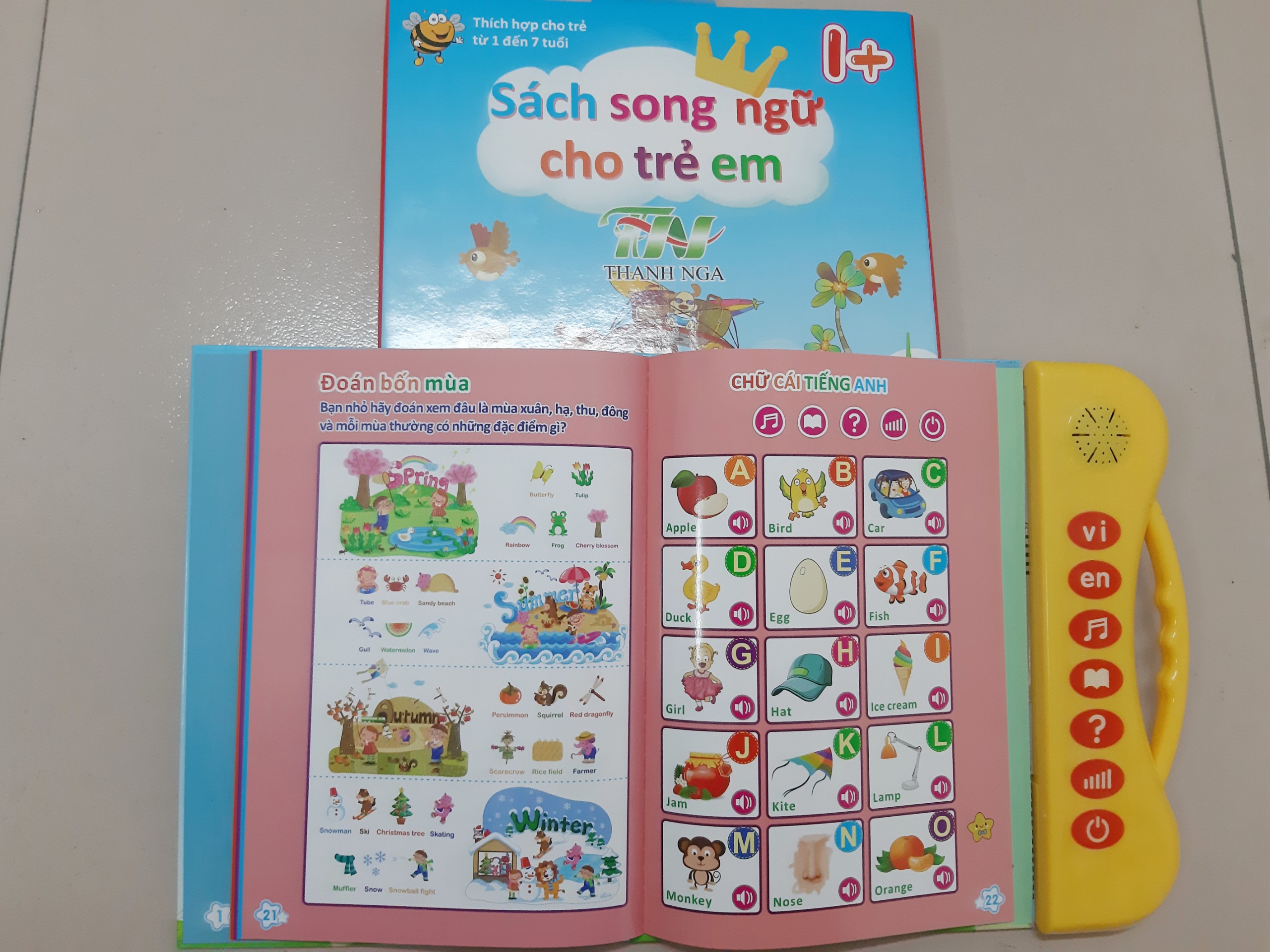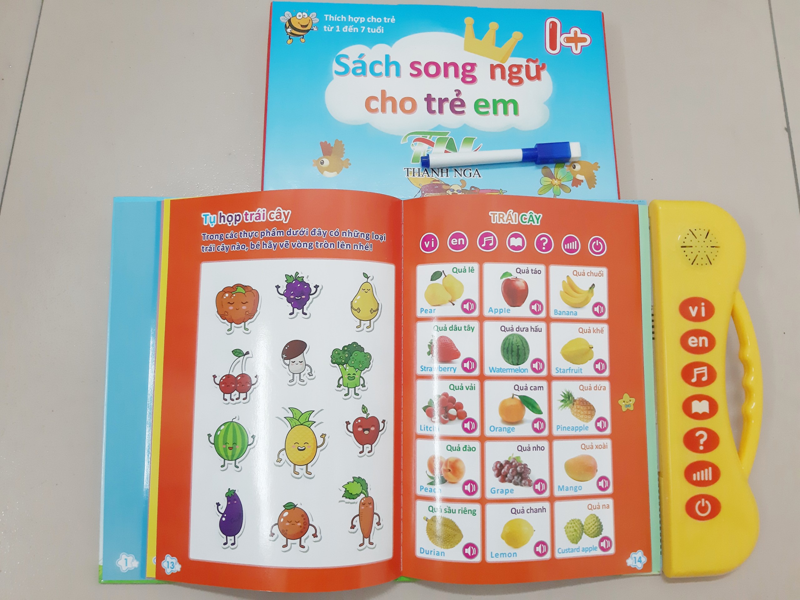 Tự động cảm biến trên từng ô chữ khi bé chạm tay vào. Giúp bé thích thú học cách nhận biết và phát âm các hình ảnh sự vật, hiện tượng, con số, làm toán... bằng tiếng Việt và tiếng Anh. Độ dài 24 trang, đa dạng về chủ đề (chữ, số, hình dạng, động vật, hoa quả, phương tiện giao thông...), trình bày đẹp mắt, vui nhộn giúp bé luôn hào hứng học tập. Mỗi trang được trình bày bằng song ngữ ANH VIỆT với phát âm cực chuẩn. Tiếng Việt phân biệt rõ ch - tr, x - s, r - d...; Tiếng Anh phát âm chuẩn bản ngữ. Sách tích hợp nhiều truyện cổ tích, các bài hát thiếu nhi và đặc biệt là các phím đàn để con thoả sức giải trí. Có các bài tập IQ, các câu hỏi tương ứng với chủ đề vừa kích thích hứng thú học tập và nâng cao tư duy cho trẻ. Có bút lông dùng để viết và nối từ có thể xóa được bằng đầu lau.