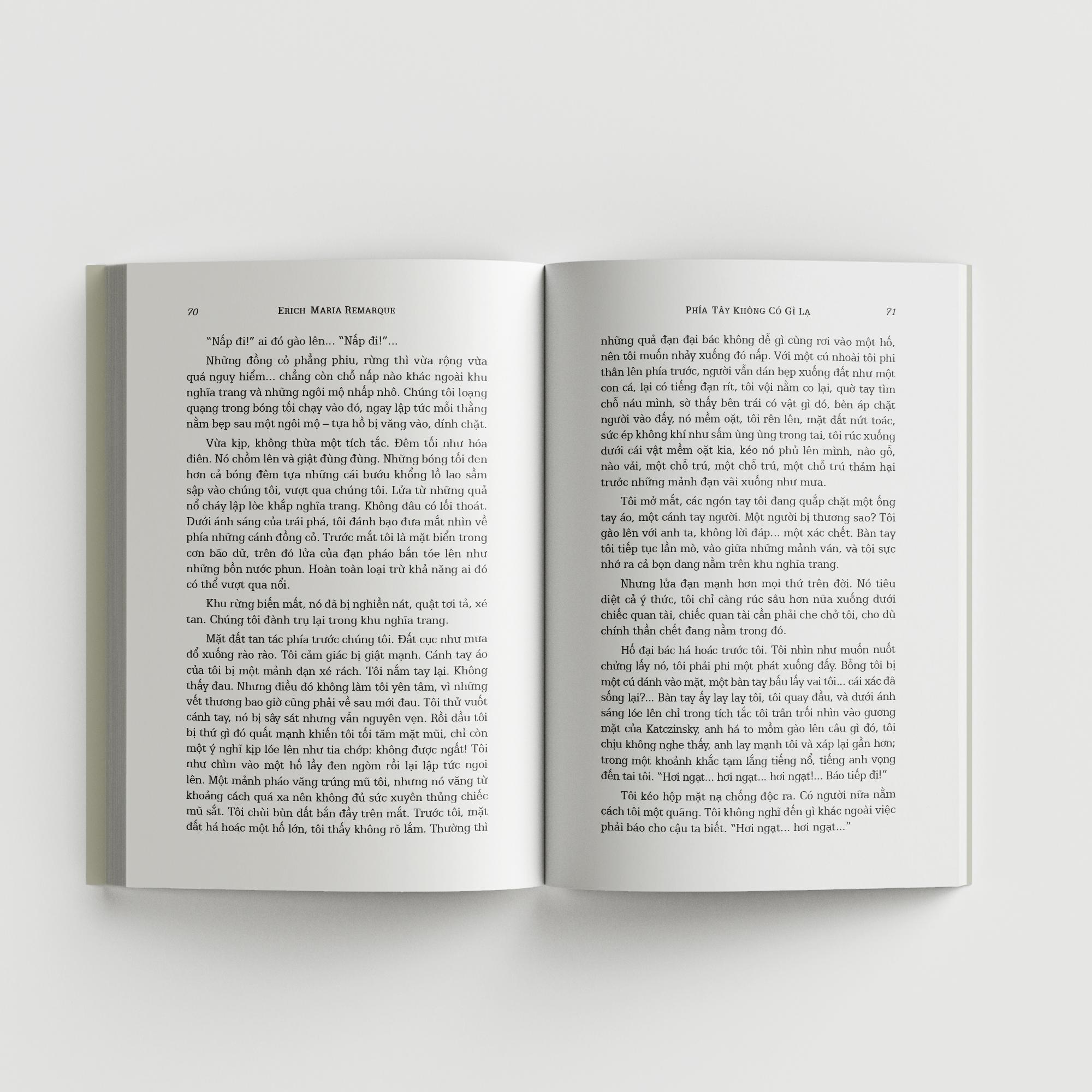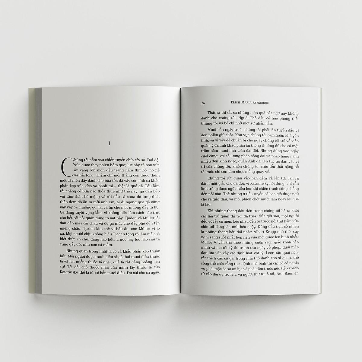 Cho nên khi tất cả đồng đội cùng trang lứa đã ngã xuống, cái chết đối với những chàng trai ấy là sự giải thoát. Họ nằm xuống nhẹ nhàng thanh thản đến độ tưởng như chẳng hề may may lay động đến thứ gì xung quanh, dù chỉ là một ngọn cỏ. Mặt trận hoàn toàn yên tĩnh, bản báo cáo chiến trường chỉ ghi vẻn vẹn một câu: “Ở phía Tây, không có gì lạ.” Phải, chẳng có gì lạ, chỉ có một người vừa rời khỏi cuộc đời khi độ tuổi mới chớm đôi mươi.