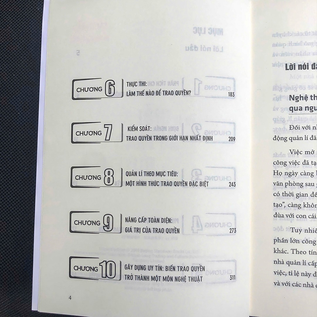 Cuốn sách này tập trung vào hai điểm chính: Thứ nhất là quy trình triển khai việc trao quyền. Phần này cung cấp nhiều kĩ năng quản lí trao quyền mang tính thực tiễn, giúp nó thực sự trở thành một giáo trình quản lí "vừa học vừa áp dụng được ngay”. Thứ hai là sự kết hợp giữa "kĩ thuật và nghệ thuật" trao quyền. Phần này tóm tắt các tình huống quản lí và những khó khăn khi quản lí, cố gắng đem lại cho các nhà quản lí những gợi mở rõ ràng hơn, bởi việc trao quyền là một nét độc đáo trong lĩnh vực quản lí, chứa đựng cả tính khoa học và nghệ thuật.
