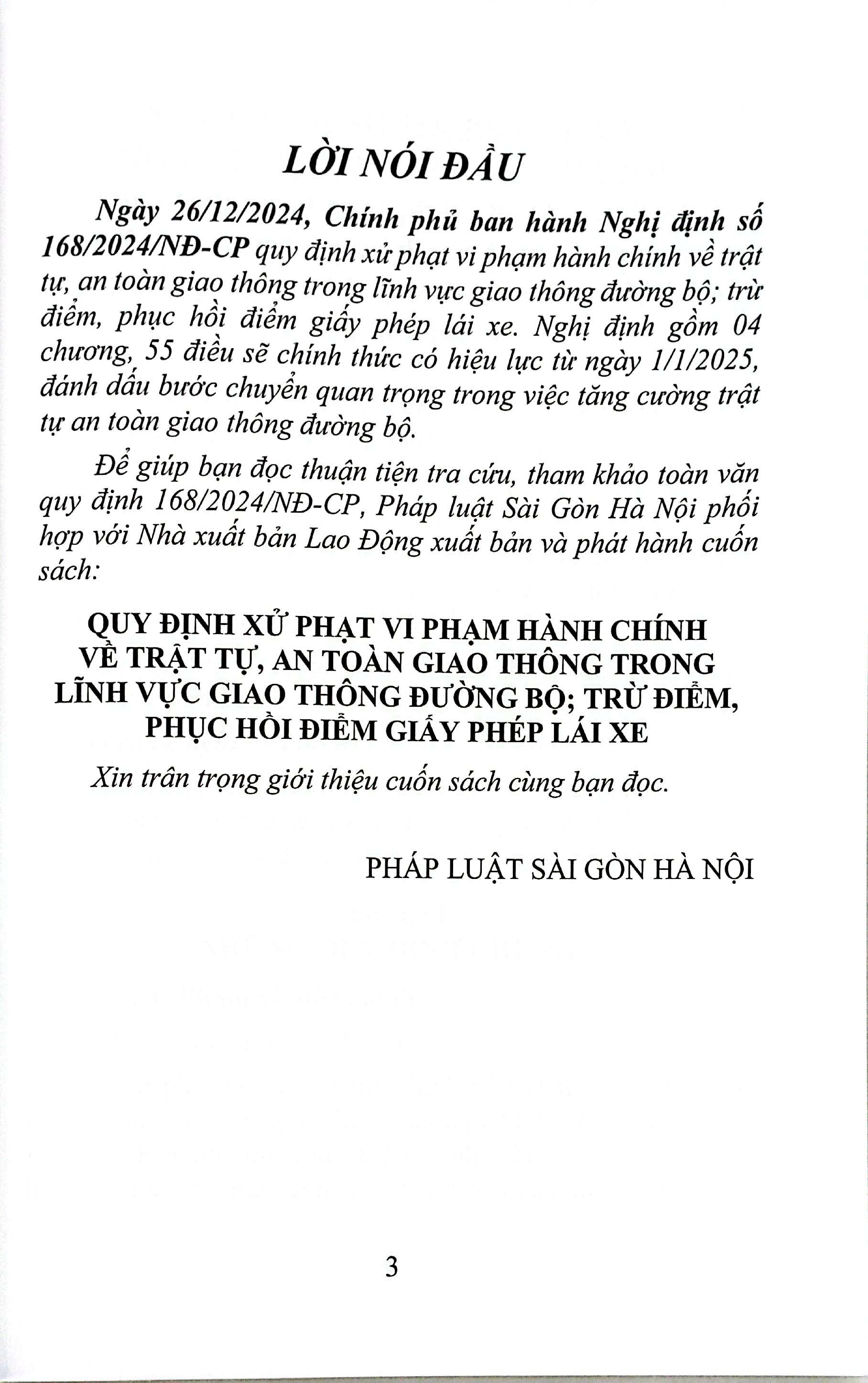 Để giúp bạn đọc thuận tiện tra cứu, tham khảo toàn văn quy định 168/2024/NĐ-CP, Pháp luật Sài Gòn Hà Nội phối hợp với Nhà xuất bản Lao Động xuất bản và phát hành cuốn sách: QUY ĐỊNH XỬ PHẠT VI PHẠM HÀNH CHÍNH VỀ TRẬT TỰ, AN TOÀN GIAO THÔNG TRONG LĨNH VỰC GIAO THÔNG ĐƯỜNG BỘ; TRỪ ĐIỂM, PHỤC HỒI ĐIỂM GIẤY PHÉP LÁI XE