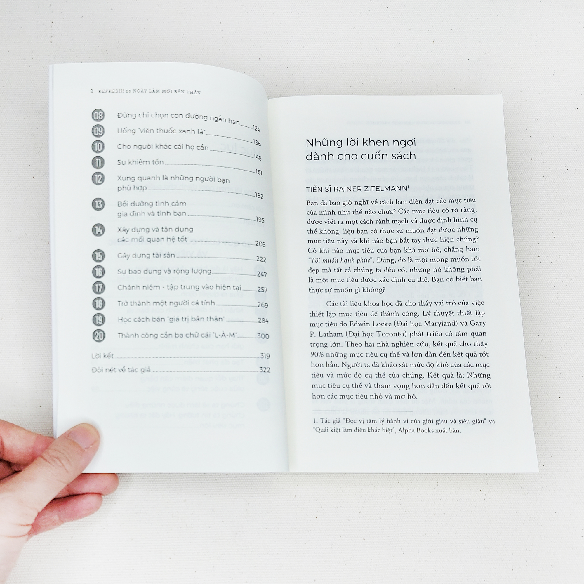 Sách - Refresh! 20 Ngày Làm Mới Bản Thân Vĩ nhân của nền văn học thế giới Johann Wolfgang von Goethe từng nói: “Không ai biết một người có sức mạnh để đi được bao xa cho đến khi anh ấy thử cố gắng.” Trước vòng xoay không ngừng của cuộc sống, rất nhiều người đã từ bỏ sự cố gắng, đánh mất sự tự tin hay chật vật để tìm lại và khám phá chính mình - một phiên bản mới mẻ, gai góc và dũng cảm hơn. Chúng ta bị nỗi sợ thất bại thống trị và áp chế. “Refresh! 20 ngày làm mới bản thân” là cuộc hành trình đi vào nội tâm để khám phá những điểm mạnh, điểm yếu của chính mình, từ đó xây dựng lộ trình cụ thể để cải tiến bản thân, hướng tới cuộc sống tích cực, hạnh phúc và ngày càng trọn vẹn. +Đánh giá chung về cuốn sách: