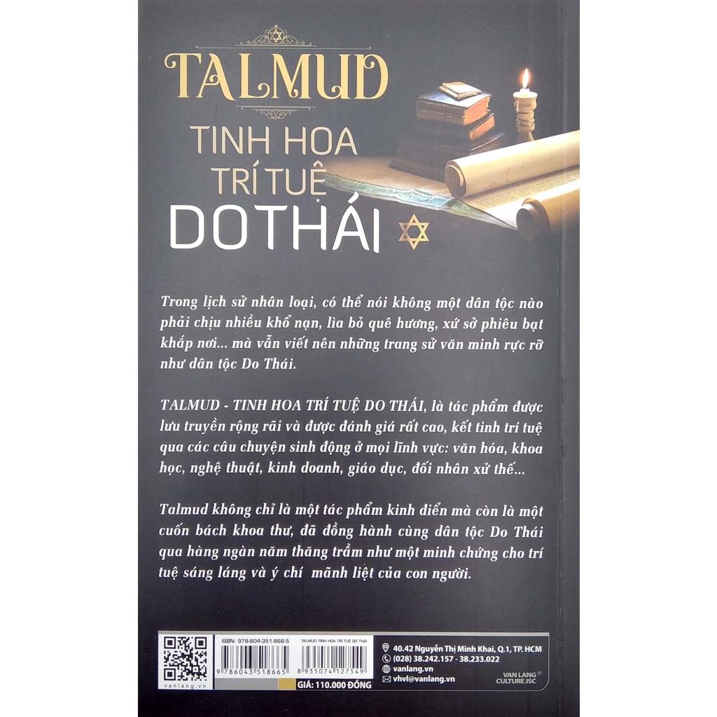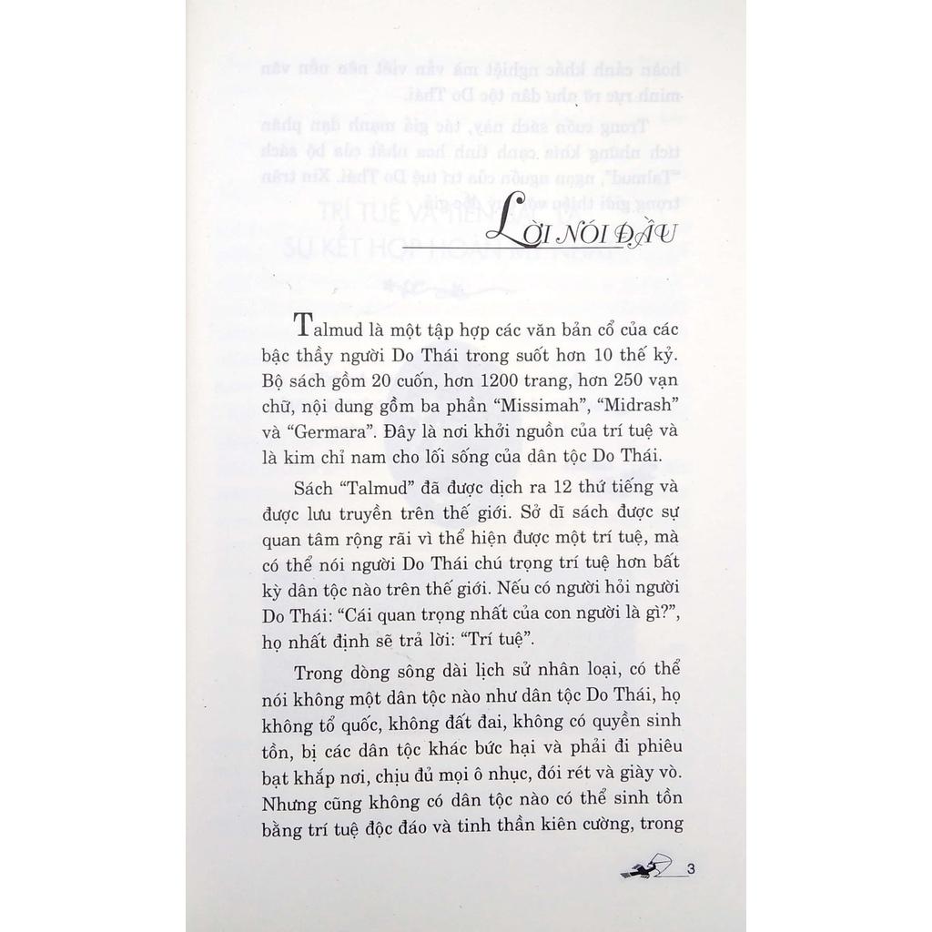 TalMud - Tinh Hoa Trí Tuệ Do Thái (Tái Bản) Talmud là một tập hợp các văn bản cổ của các bậc thầy người Do Thái trong suốt hơn 10 thế kỷ. Bộ sách gồm 20 cuốn, hơn 1200 trang, hơn 250 vạn chữ, nội dung gồm ba phần “Missimah”, “Midrash” và “Germara”. Đây là nơi khởi nguồn của trí tuệ và là kim chỉ nam cho lối sống của dân tộc Do Thái. Sách “Talmud” đã được dịch ra 12 thứ tiếng và được lưu truyền trên thế giới. Sở dĩ sách được sự quan tâm rộng rãi vì thể hiện được một trí tuệ, mà có thể nói người Do Thái chú trọng trí tuệ hơn bất kỳ dân tộc nào trên thế giới. Nếu có người hỏi người Do Thái: “Cái quan trọng nhất của con người là gì?”, họ nhất định sẽ trả lời: “Trí tuệ”. Cuốn sách này sẽ đề cập đến tinh hoa của Talmud qua các câu chuyện sinh động ở mọi lĩnh vực: văn hóa, khoa học, nghệ thuật, kinh doanh, giáo dục, đối nhân xử thế…