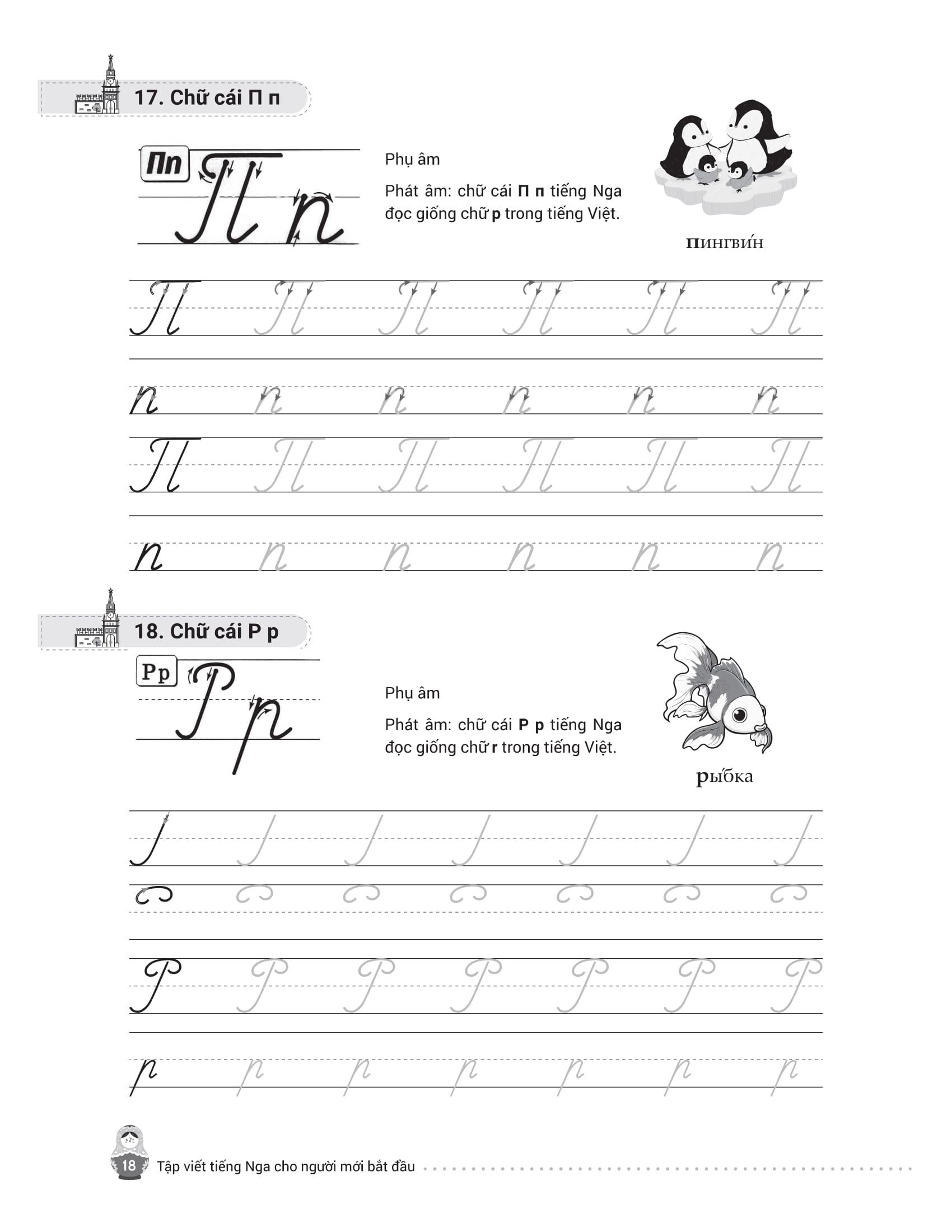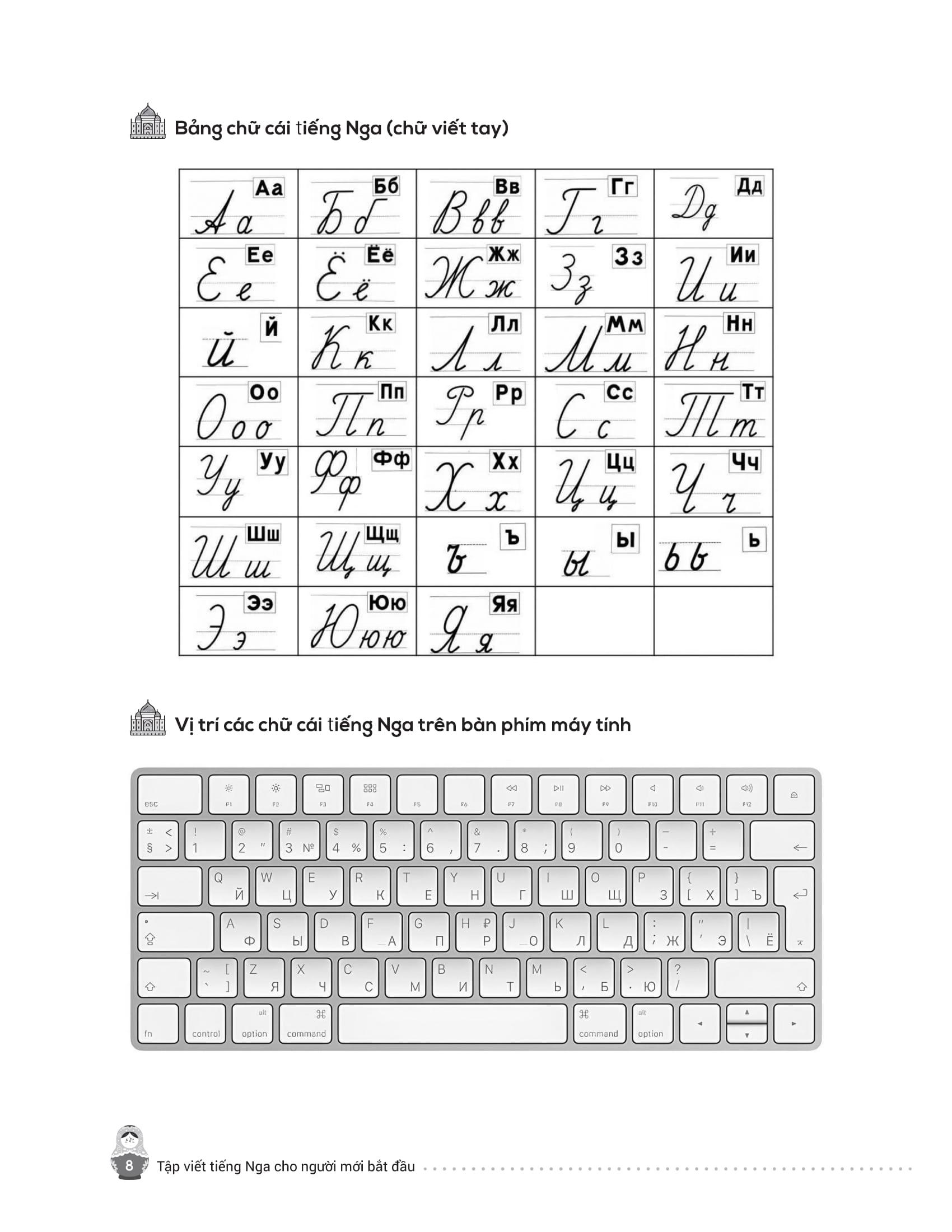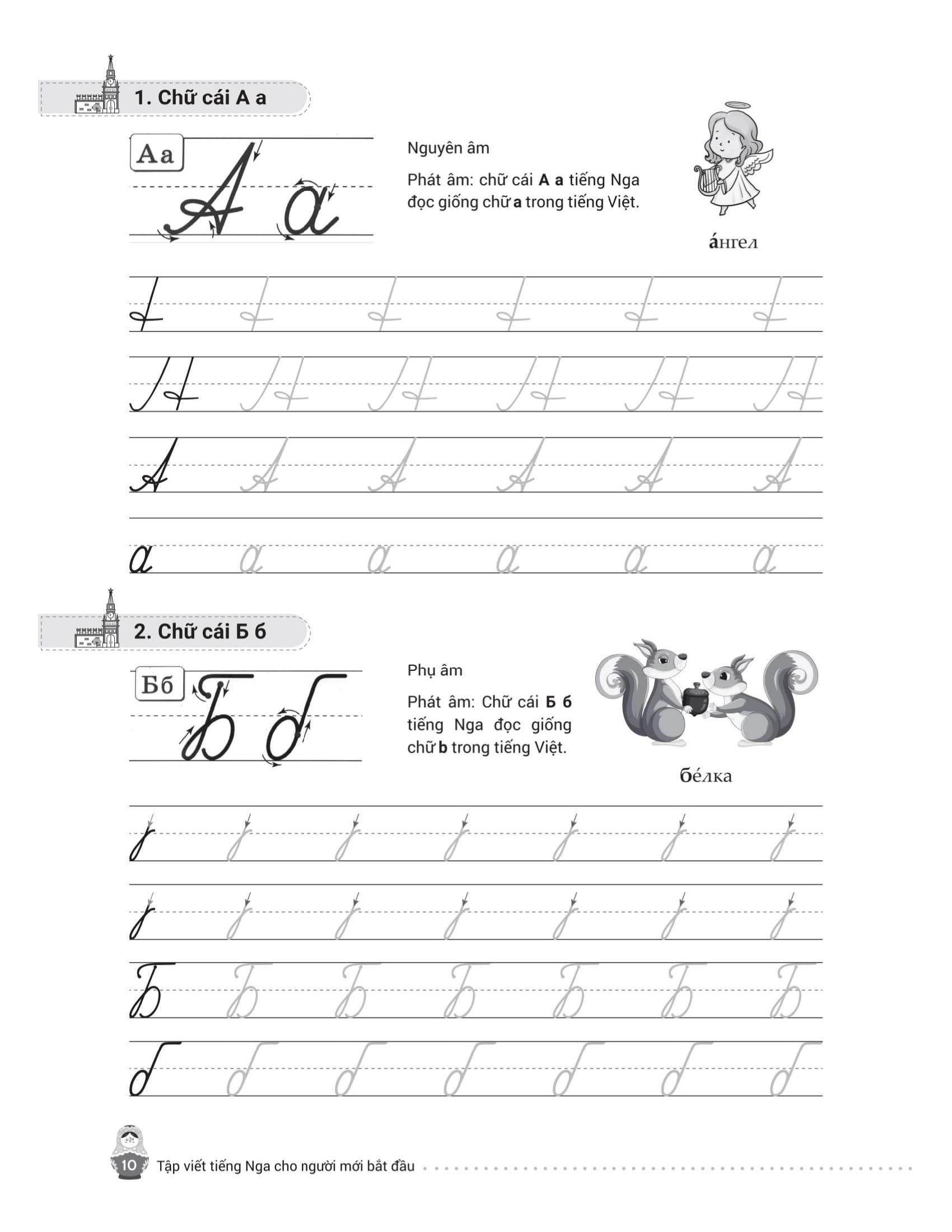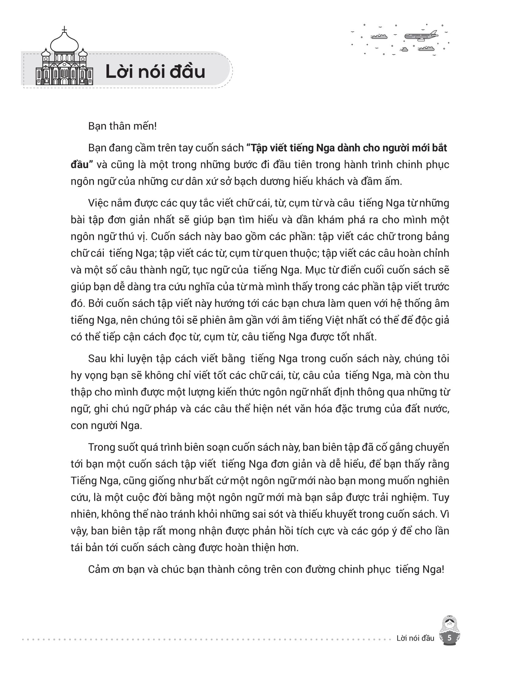 - Từ điển mini cuối sách giúp tra cứu và ghi nhớ từ vựng nhanh chóng. Trên đây là những nội dung nổi bật của cuốn sách mà chúng tôi muốn gửi đến bạn đọc – những ai đang bắt đầu hành trình chinh phục tiếng Nga từ những nét chữ đầu tiên. Hy vọng cuốn sách sẽ là người bạn đồng hành hữu ích, giúp bạn học dễ dàng, luyện viết hiệu quả và thêm yêu ngôn ngữ giàu văn hóa này. Chúc bạn học tốt và sớm đạt được mục tiêu của m.ình!
