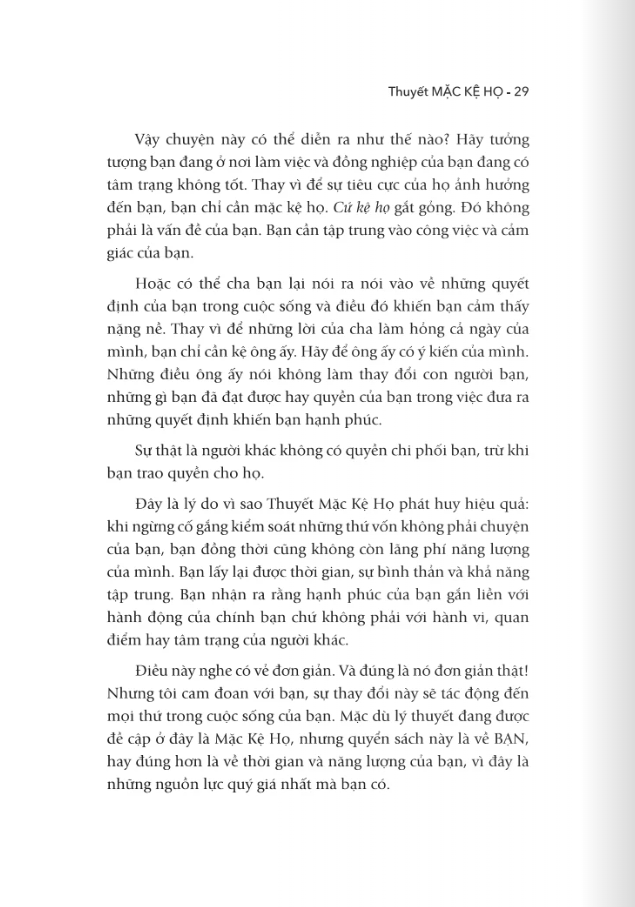 • Làm thế nào để ngừng lãng phí năng lượng vào những điều bạn không thể thay đổi và tập trung vào việc kiến tạo cuộc đời bạn muốn. Hơn Cả Một Cuốn Sách: "Thuyết Mặc Kệ Họ" "Thuyết Mặc Kệ Họ" là lời mời gọi bạn thay đổi tư duy, lấy lại quyền tự chủ và kiến tạo một cuộc sống tự do, hạnh phúc. Đây là cẩm nang thiết yếu cho bất kỳ ai đang kát khao thoát khỏi những ràng buộc vô hình và sống một cuộc đời trọn vẹn theo cách riêng của m.ình. NGAY HÔM NAY HÃY BẮT ĐẦU TÁI LẬP QUYỀN KIỂM SOÁT CUỘC ĐỜI BẠN VỚI "THUYẾT MẶC KỆ HỌ"!