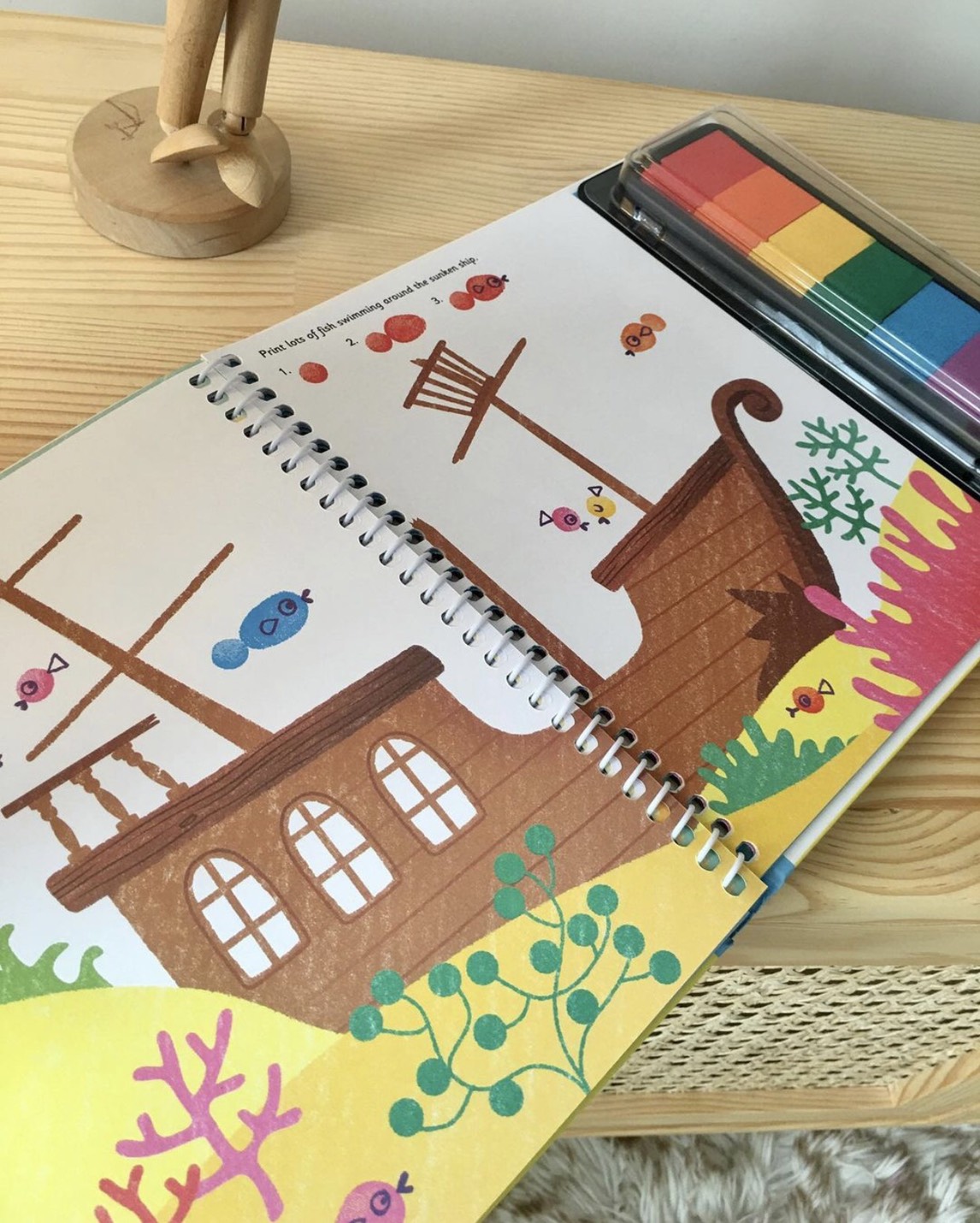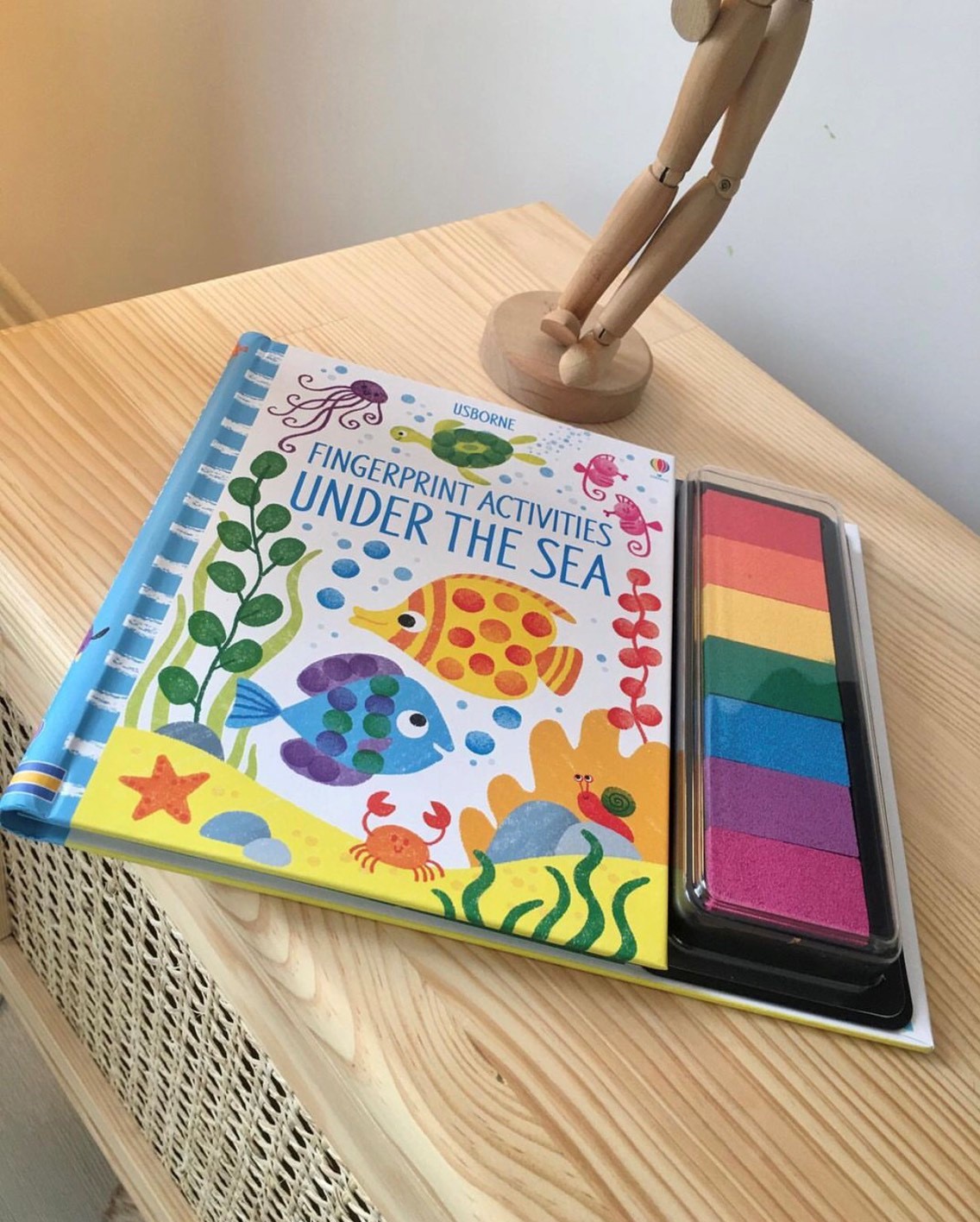 Mua tại TiktokBursting with fun fingerprinting ideas, this colourful activity book comes with its own inkpad of seven bright colours. Decorate the underwater scenes with sharks, seahorses, narwhals, penguins and even a sunken ship. There are simple instructions showing how to fingerprint each creature and the book has a spiral binding so that it lies flat .