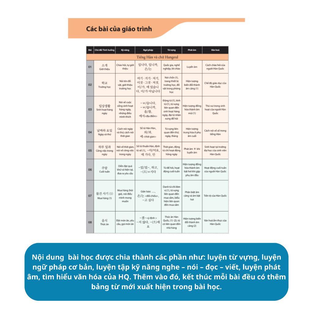 Các chủ đề trong sách được sắp xếp một cách có hệ thống và liên quan chặt chẽ với nhau. Giáo trình tiếng Hàn tổng hợp được biên soạn kèm theo một cuốn sách bài tập hỗ trợ giúp người học ôn tập kỹ hơn và có thể luyện tập nâng cao trong những trường hợp cần thiết.