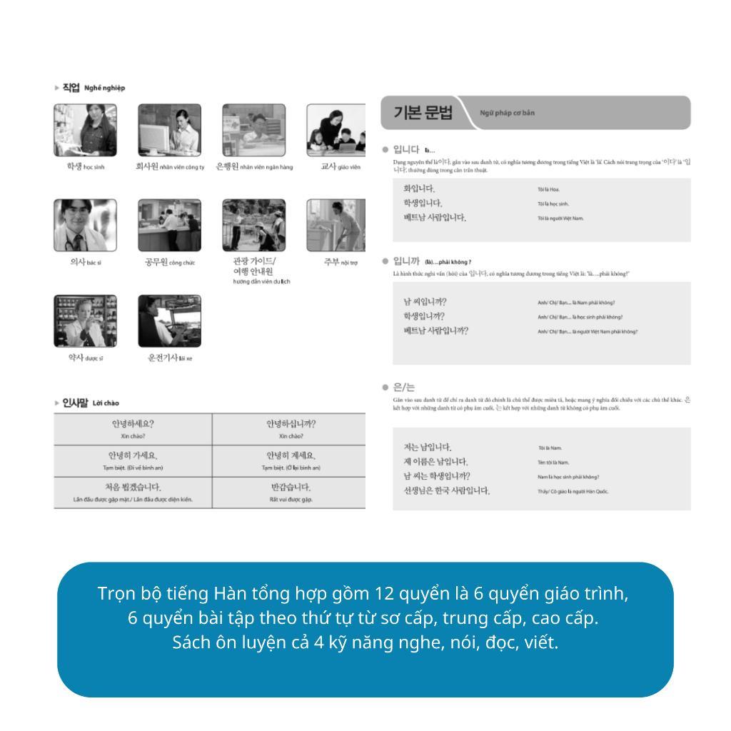 Sách - Tiếng Hàn Tổng Hợp Dành Cho Người Việt Nam - Tập 1 đến tập 6 - Giáo trình kèm sách bài tập giúp bạn nhanh chóng rèn luyện các kỹ năng nghe – nói – đọc – viết tiếng Hàn thành thạo.