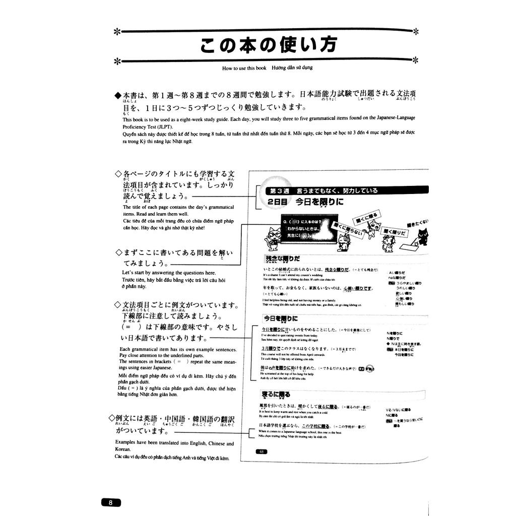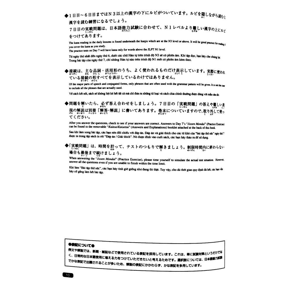 GIỚI THIỆU SÁCH Luyện Thi Năng Lực Nhật Ngữ N1 - Ngữ Pháp Luyện thi Năng lực Nhật ngữ N1 gồm 5 quyển: Hán tự (Kanji), Từ vựng (Goi), Đọc hiểu (Dokkai), Nghe hiểu (Choukai) và Ngữ pháp (Bunpou). Đây là một tựa sách học tiếng Nhật hàng đầu trong hệ thống phân phối sách Kinokuniya lớn nhất Nhật Bản. Bộ sách này giúp những bạn chuẩn bị tham gia Kỳ thi năng lực Nhật ngữ JLPT nắm được những nội dung kiến thức cần phải có trong năng lực Nhật ngữ - trình độ N1 một cách nhanh chóng, hiệu quả và tổng quát nhất trong khoảng thời gian từ 4 đến 6 tuần.