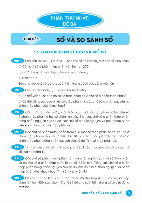 - Phần thứ nhất là đề bài được phân theo các chủ đề trong chương trình môn Toán của mỗi lớp: Số và So sánh số, Các phép tỉnh, Hình học, Đo lường, Xác suất và Thống kê, Vận dụng toàn trong đời sống.