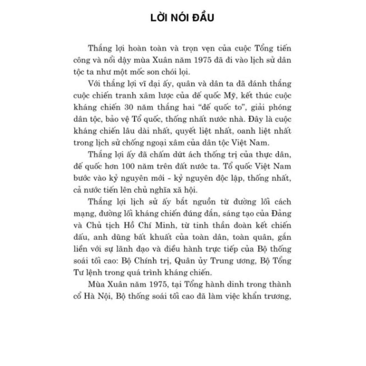 Cuốn hồi ức Tổng hành dinh trong mùa Xuân toàn thắng gồm 10 chương, trong đó Đại tướng dành chín chương viết về các sự kiện lịch sử lớn của dân tộc và chương cuối cùng trình bày những điều tâm huyết, đúc kết cuộc đời cầm quân quang vinh của mình qua những năm tháng khốc liệt của chiến tranh. Cuốn sách giúp độc giả thấy rõ bản lĩnh và trí tuệ Việt Nam ở những thời điểm lịch sử quyết định: nhạy bén, sáng tạo, quyết đoán, nắm bắt thời cơ và nỗ lực cao độ nhằm quét sạch quân thù.