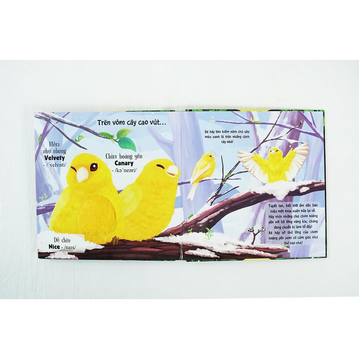 Hai chủ đề đầu tiên của sách sờ chạm gồm: Thế giới động vật - Một ngày giữa thiên nhiênThế giới động vật - Bốn mùa tươi đẹp