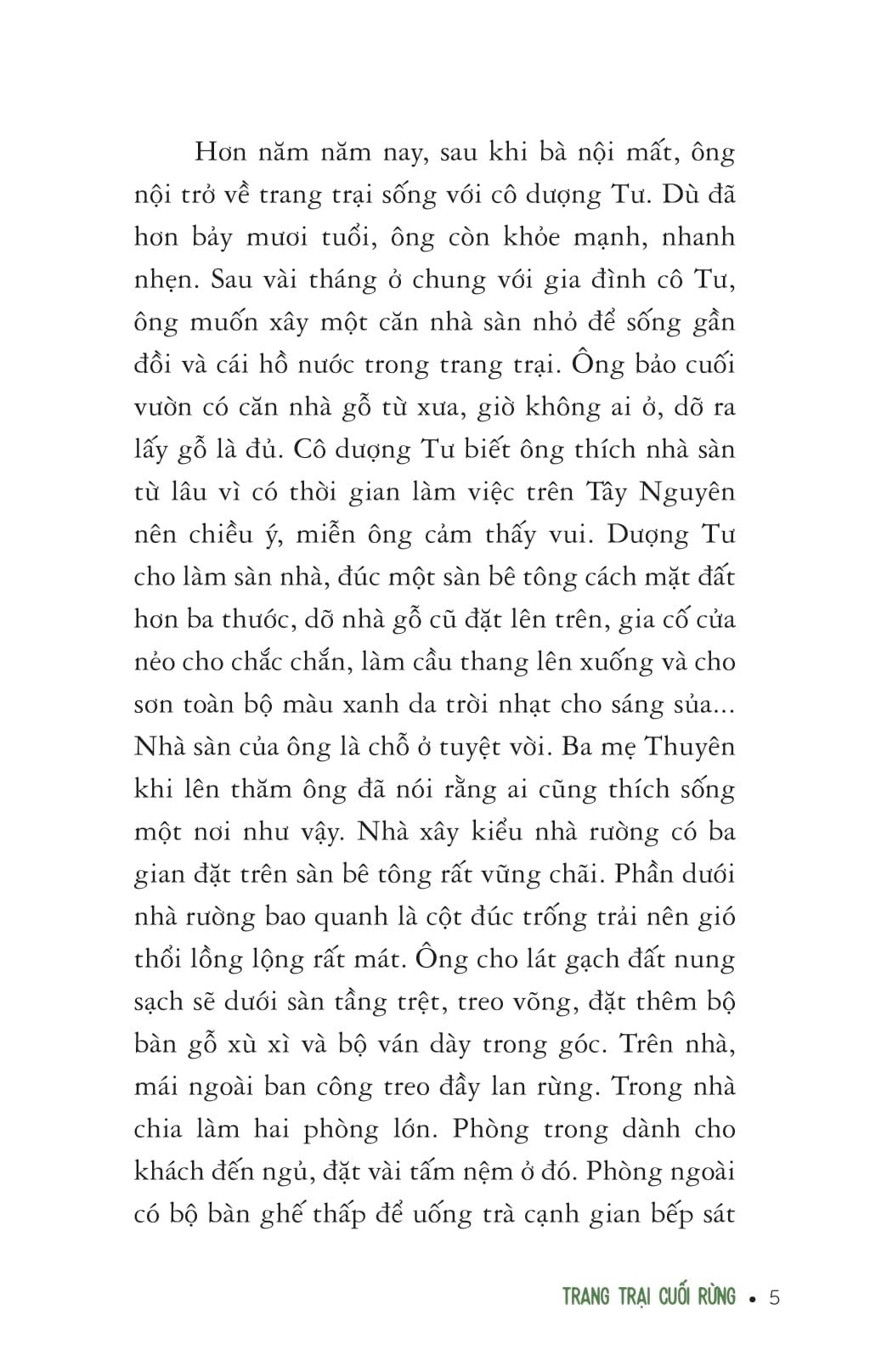“Thuyên nghĩ miên man: Mình thật may mắn khi có một nơi để sống ba tháng Hè tuyệt vời như vậy. Có bao nhiêu điều đầy cảm xúc mà Thuyên được chứng kiến. Có bỡ ngỡ, lo lắng, hốt hoảng, bất ngờ, ngạc nhiên. Có bao nhiêu chuyện đời được kể. Có tình bạn mới và chứng kiến một tình bạn cũ đang hồi sinh.” (Trích “Trang trại cuối rừng”)