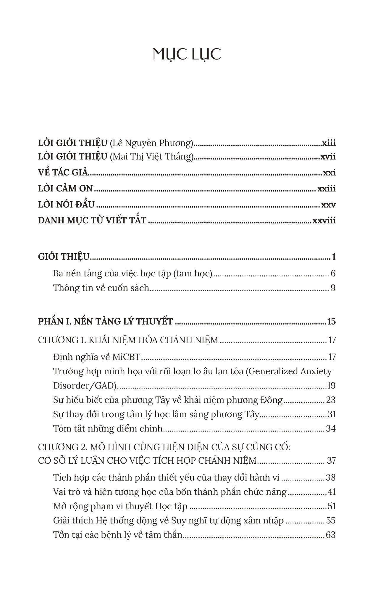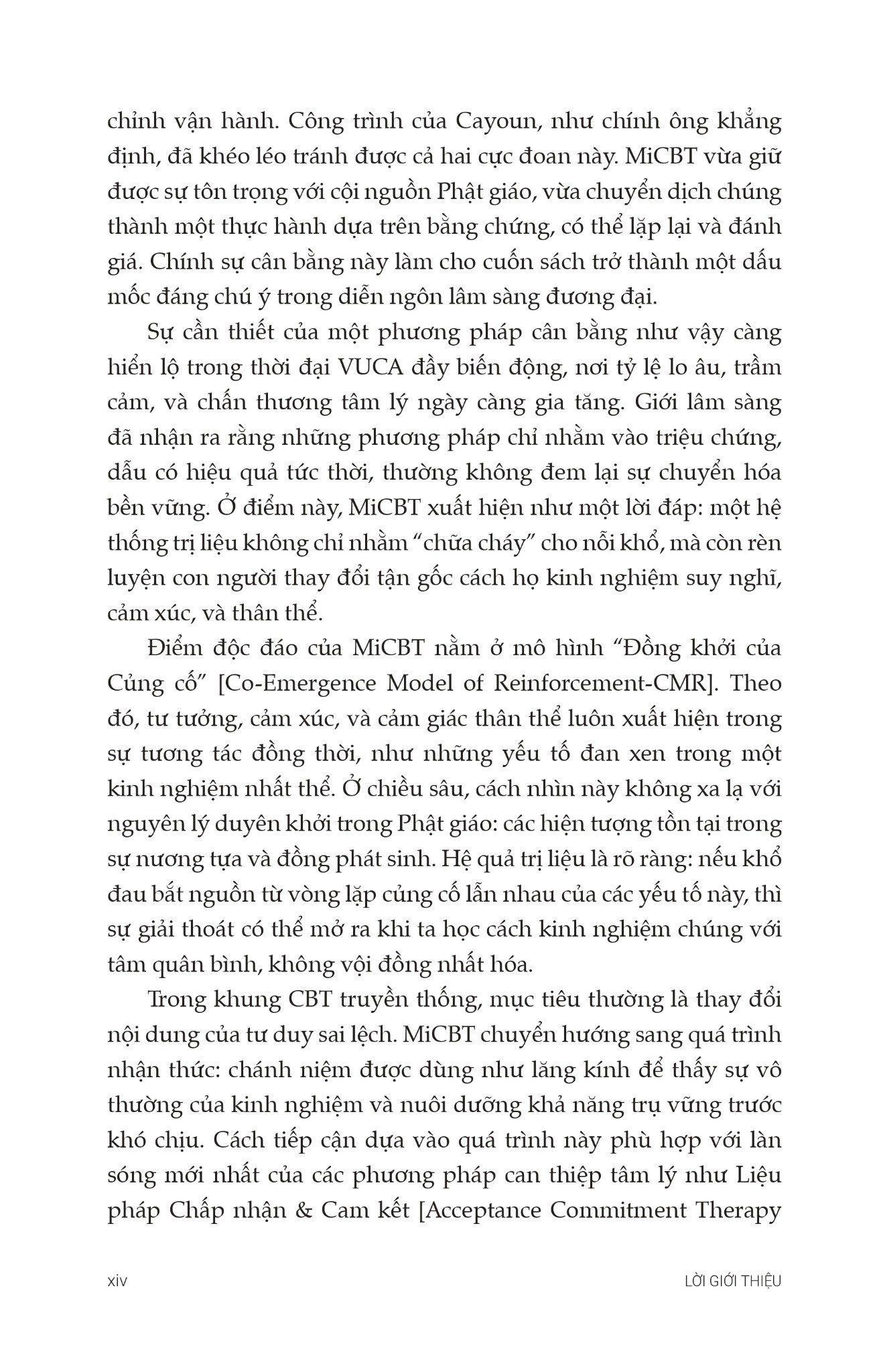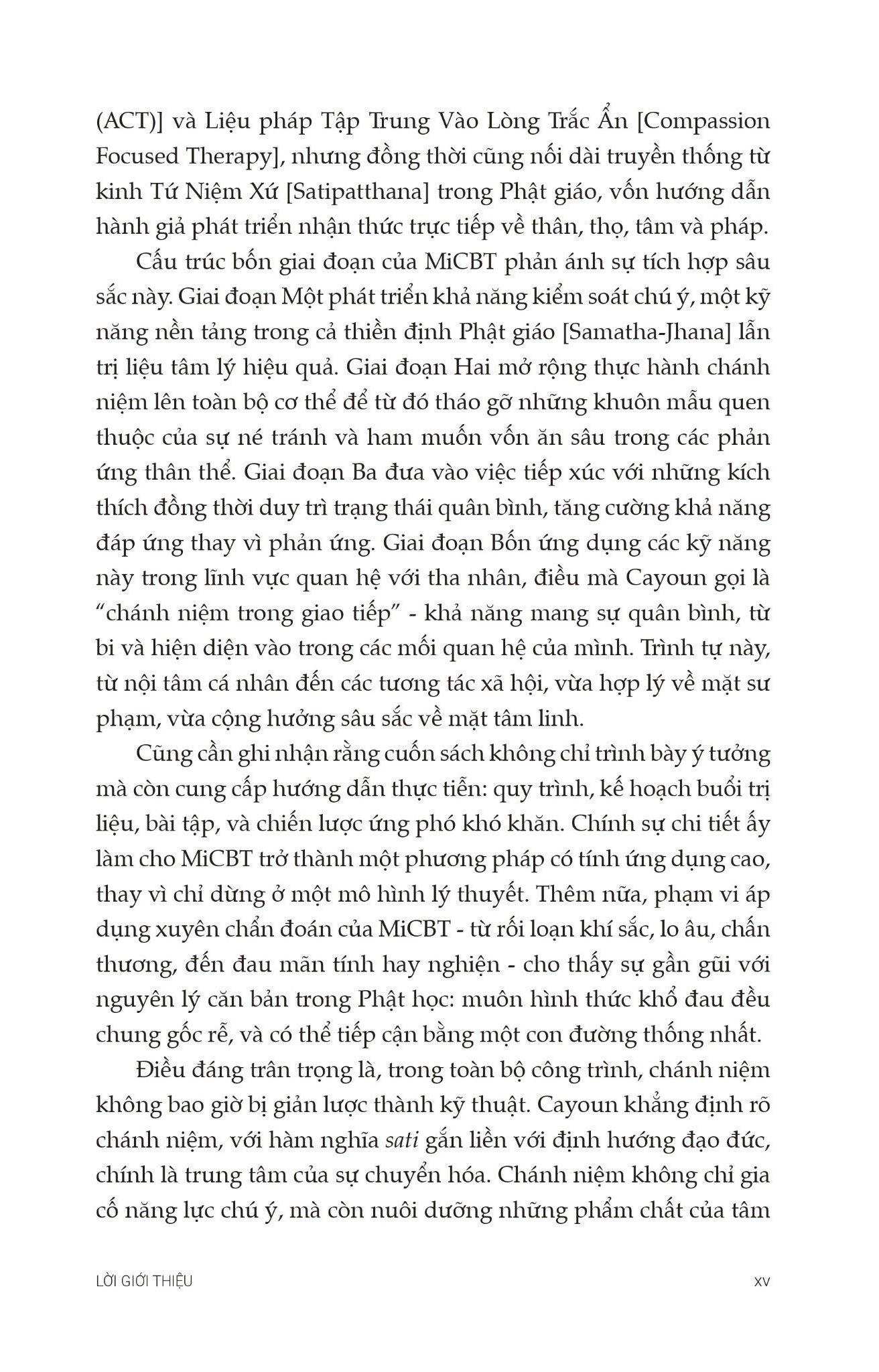 Trị Liệu Nhận Thức Hành Vi Tích Hợp Chánh Niệm - Nguyên Tắc và Thực Hành Trong tâm lý học hiện đại, CBT (Cognitive Behavioral Therapy - Liệu pháp Nhận thức Hành vi) là một trong những phương pháp trị liệu hiệu quả và phổ biến. Phương pháp CBT dựa trên giả định rằng cảm xúc và hành vi tiêu cực phần lớn bắt nguồn từ cách chúng ta suy nghĩ về sự việc, chứ không phải hoàn toàn do hoàn cảnh bên ngoài. Do đó, mục tiêu chính của CBT là giúp thân chủ nhận ra và thay đổi những suy nghĩ sai lệch, từ đó điều chỉnh cảm xúc và hành vi theo hướng tích cực. CBT là một phương pháp linh hoạt, có thể kết hợp với nhiều kỹ thuật trị liệu khác để tăng hiệu quả. Một trong những hướng kết hợp nổi bật là với Chánh niệm (Mindfulness) - một khái niệm có nguồn gốc từ Phật giáo, nay đã được ứng dụng trong tâm lý học lâm sàng như một kỹ thuật mang tính khoa học. Chánh niệm giúp người thực hành rèn luyện khả năng quan sát nội tâm, tiếp xúc trực tiếp với cảm xúc thay vì né tránh hay phản ứng theo thói quen. Từ sự kết hợp này, MiCBT (Mindfulness-integrated Cognitive Behavioral Therapy - Liệu pháp Nhận thức Hành vi tích hợp Chánh niệm) ra đời. Phương pháp này được phát triển bởi Tiến sĩ Bruno Cayoun, một nhà trị liệu, cũng là người thực hành chánh niệm, với trên 22 năm kinh nghiệm trị liệu, giảng dạy, điều hành viện MiCBT và có kinh nghiệm nghiên cứu tại đại học Tasmania, Úc. Ông xây dựng MiCBT như một mô hình trị liệu có cấu trúc rõ ràng, hướng đến đ.iều trị các rối loạn như lo âu, trầm cảm, OCD, rối loạn lo âu xã hội và các khó khăn về điều tiết cảm xúc. Điểm đặc biệt là, MiCBT không mang màu sắc tôn giáo, dù sử dụng kỹ thuật thực hành Chánh niệm có nguồn gốc từ Phật giáo.Các kỹ thuật được điều chỉnh phù hợp với bối cảnh trị liệu hiện đại, dựa trên bằng chứng thực nghiệm. Chánh niệm trong MiCBT không chỉ giúp người học “nghĩ khác đi” như trong CBT, mà còn “trải nghiệm khác đi” - chấp nhận cảm xúc khó chịu một cách tỉnh thức thay vì né tránh. Từ nền tảng đó, cuốn sách Trị liệu Nhận thức Hành vi Tích hợp Chánh niệm: Nguyên tắc và Thực hành ra đời như một hướng dẫn toàn diện cho các nhà trị liệu, giảng viên và cả những người thực hành quan tâm đến MiCBT. Sách không chỉ trình bày lý thuyết một cách rõ ràng mà còn cung cấp hướng dẫn cụ thể từng bước để ứng dụng trong thực tế lâm sàng. Nội dung sách được chia thành 5 phần chính: