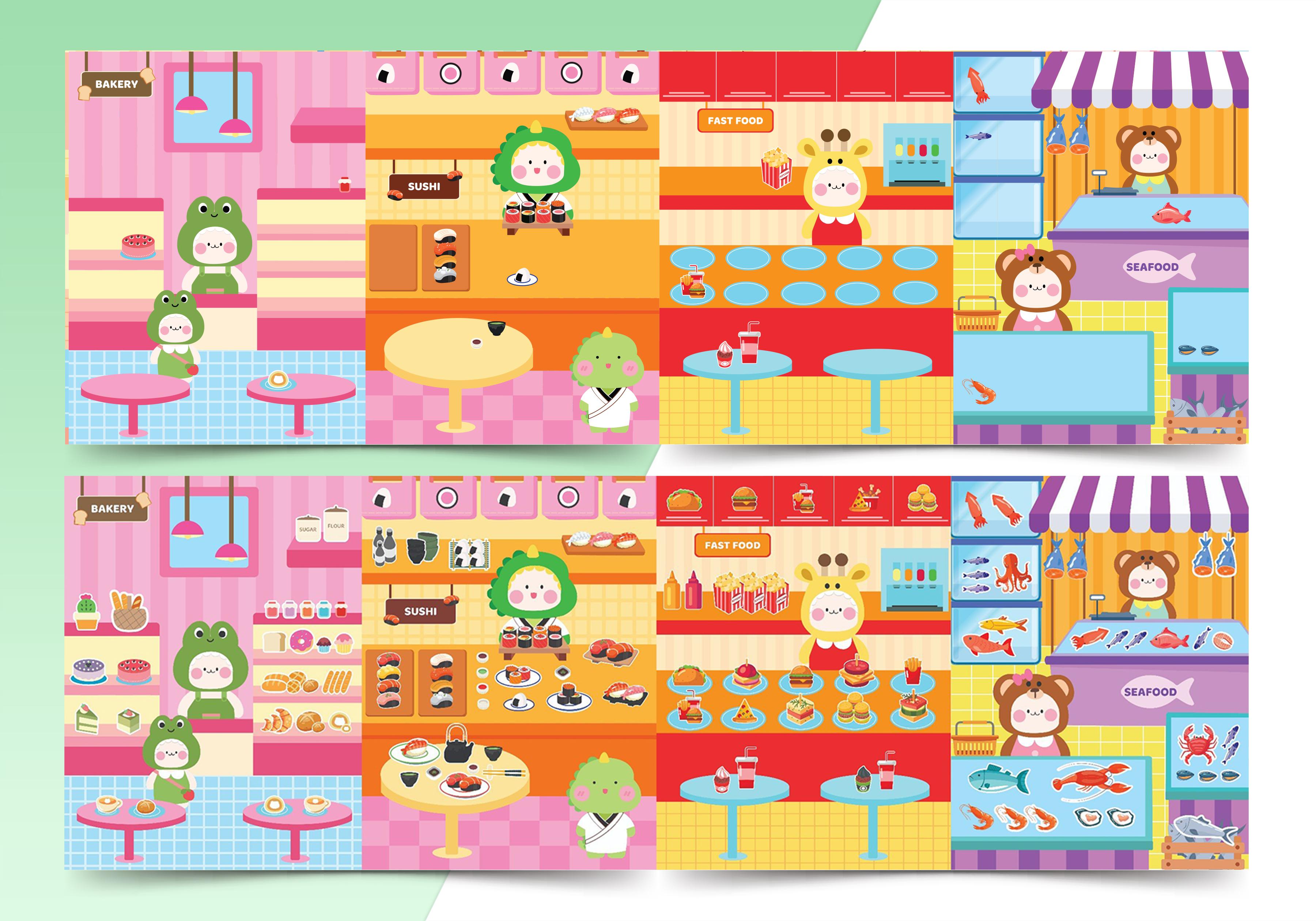 Phát triển kỹ năng tập trung và tư duy logic thông qua việc sắp xếp sticker theo từng cửa hàng ẩm thực.
