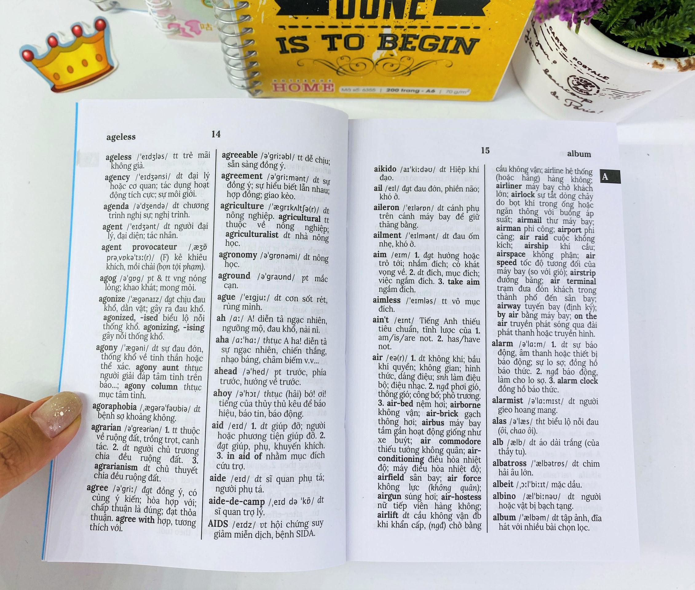 Mô tả sản phẩm Cuốn từ điển này được biên soạn từ những cuốn từ điển nổi tiếng của Anh, Mỹ, được dùng trong các trường học cũng như ở các văn phòng giao dịch. Các thuật ngữ tiếng Việt cũng được biên soạn theo đúng tiêu chuẩn tiếng Việt hiện đại. Các ví dụ minh hoạt được chọn lọc tiêu biểu, dễ hiểu và phổ biến trong cách nói cũng như cách viết của đại đa số người Anh sử dụng.