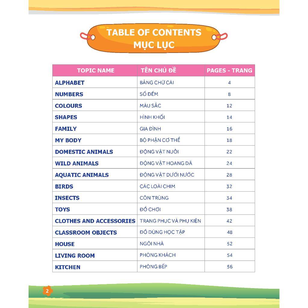 Cuốn sách gồm trên 35 chủ để thưởng gặp như gia đình, nghề nghiệp, màu sắc, hình khối... Với hơn 2000 từ vựng tiếng Anh thông dụng được trình bày theo dạng sơ đồ tư duy cùng hình ảnh vô cùng sinh động, đáng yêu.