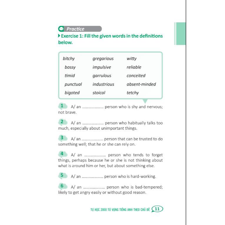 Điểm đặc biệt nhất của cuốn sách này là phần bài tập kèm theo mỗi chủ đề, không chỉ học lý thuyết đơn thuần mà bạn còn được thực hành sử dụng những từ vựng ấy trong thực tế. Với cách học này, bạn có thể hiểu một cách cặn kẽ cũng như khắc sâu từ vựng mình đã học , đảm bảo vốn từ vựng của bạn sẽ được cải thiện một cách rõ rệt.
