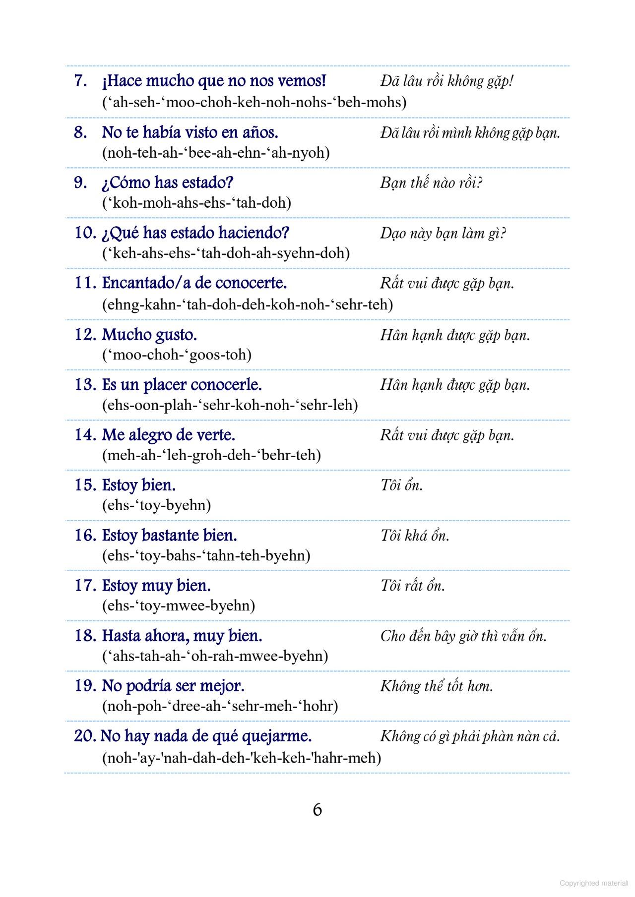 Mỗi câu đều được trình bày song ngữ Tây Ban Nha – Việt, kèm phiên âm chi tiết, giúp bạn dễ dàng tiếp cận, ghi nhớ và sử dụng. Dù bạn là người mới bắt đầu hay đã có nền tảng tiếng Tây Ban Nha, cuốn sách này đều có thể đồng hành cùng bạn trên hành trình chinh phục ngôn ngữ thú vị này.