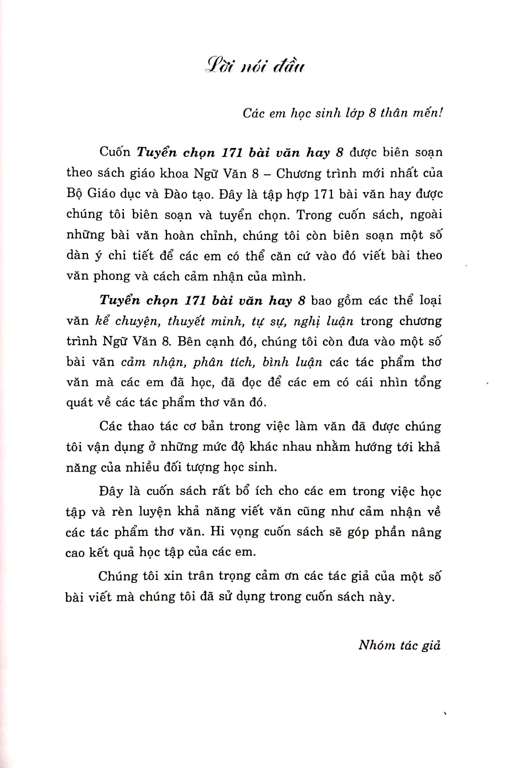 Sáchđược biên soạn theo sách giáo khoa Ngữ Văn 8 – Chương trình mới nhất của Bộ Giáo dục và Đào tạo. Đây là tập hợp 171 bài văn hay được chúng tôi biên soạn và tuyển chọn. Trong cuốn sách, ngoài những bài văn hoàn chỉnh, chúng tôi còn biên soạn một số dàn ý chi tiết để các em có thể căn cứ vào đó viết bài theo văn phong và cách cảm nhận của m.ình.