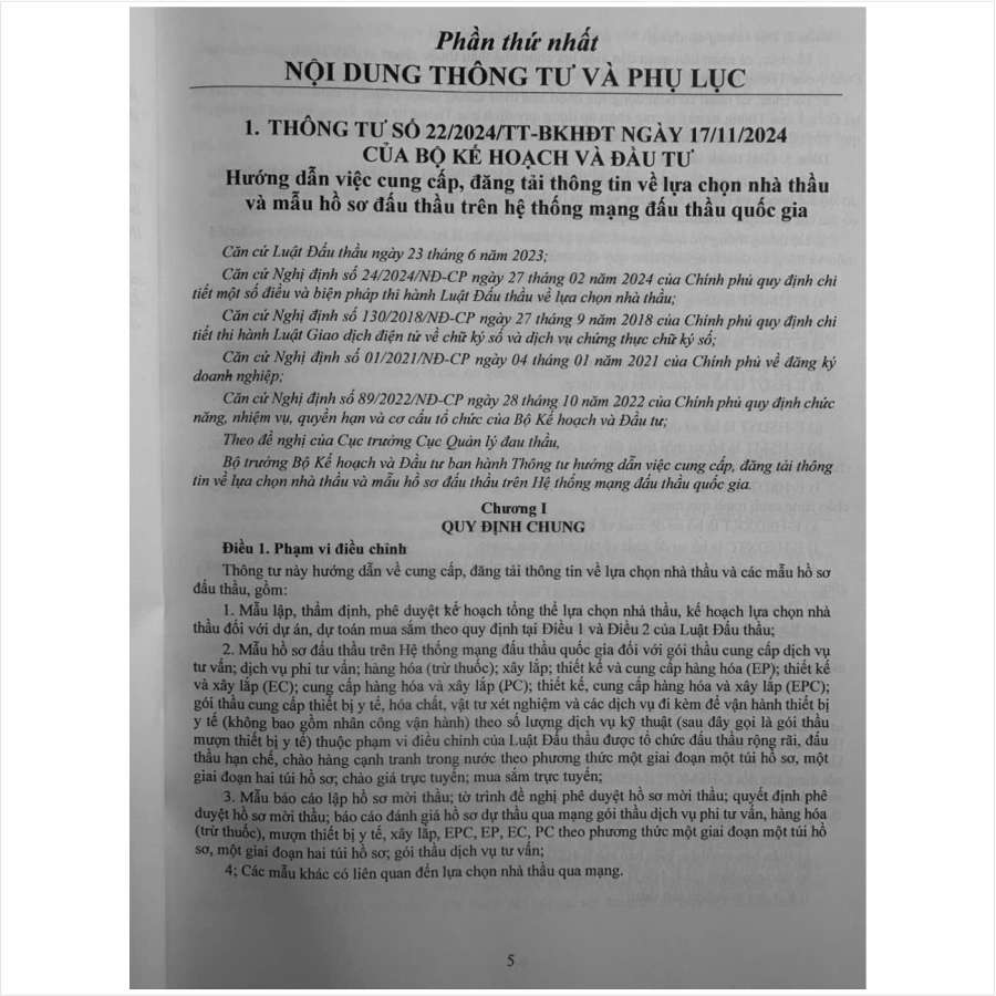 Ngày 17/11/2024, Bộ Kế hoạch và Đầu tư đã ban hành Thông tư số 22/2024/TT-BKHĐT hướng dẫn việc cung cấp, đăng tải thông tin về lựa chọn nhà thầu và mẫu hồ sơ đấu thầu trên Hệ thống mạng đấu thầu quốc gia.