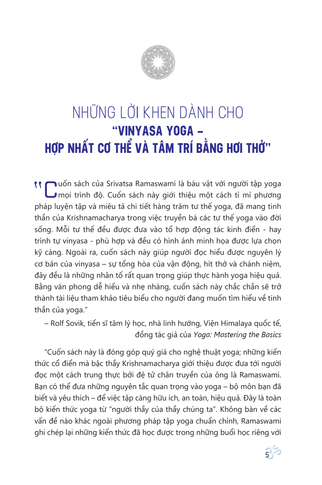 Phần mở đầu của sách là những chia sẻ của tác giả về quá trình 33 năm học tập dưới trướng T. Krishnamacharya, người sáng tạo ra trường phái Vinyasa yoga, và cùng với những chia sẻ cá nhân của ông sau hơn hai thập kỷ làm việc dưới cương vị giáo viên Yoga. Sau đó chúng ta đến nội dung chính của cuốn sách là 12 chương tương ứng cho 12 trình tự động tác cùng với 1000 ảnh màu minh họa rõ nét động tác và quy trình thở dưới những lời hướng dẫn chi tiết của tác giả.