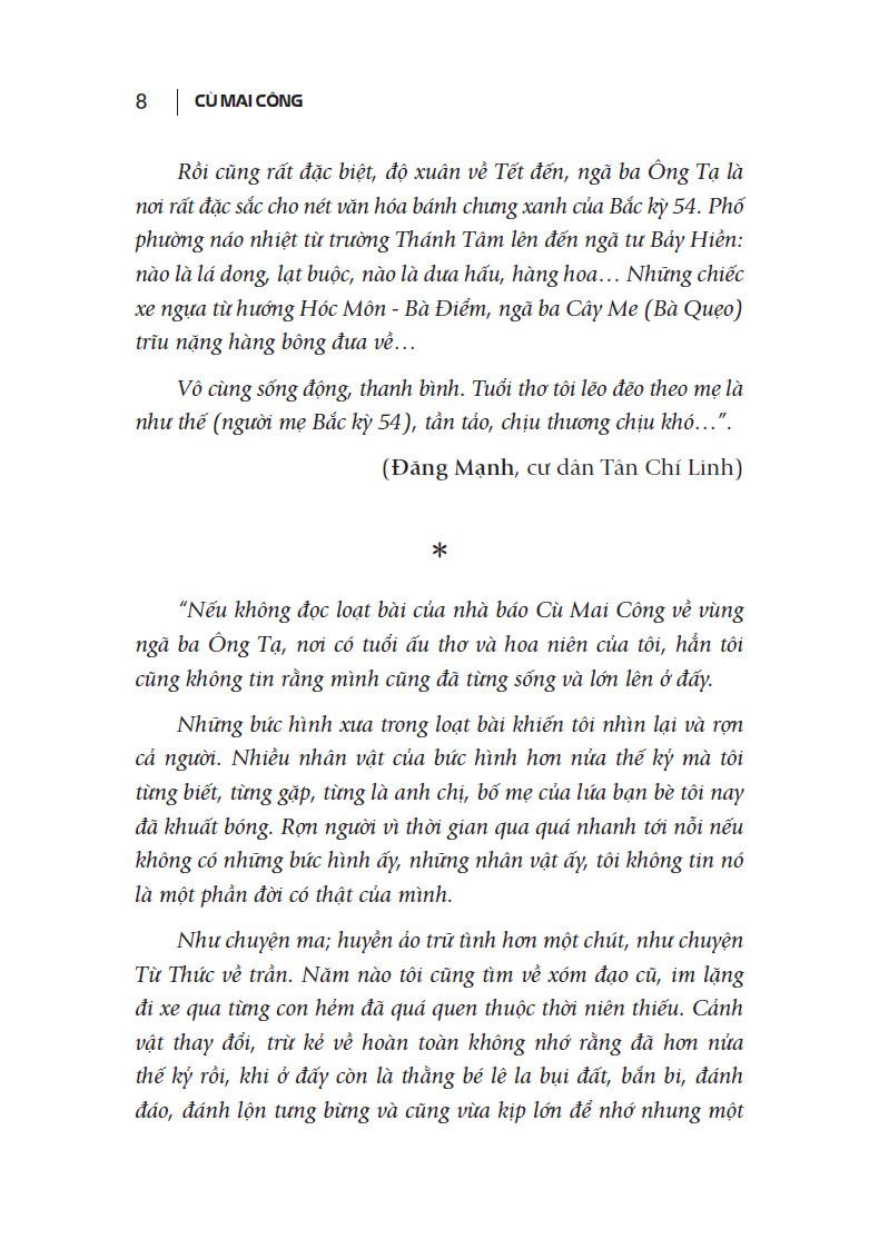 Không dừng lại ở đó, đan xen trong những câu chuyện vui buồn của cư dân Ông Tạ là tuổi thơ đầy màu sắc của tác giả Cù Mai Công. Anh là một nhân chứng của Ông Tạ từ những ngày đầu tiên, đi qua những tháng ngày đẹp nhất cũng như những thời khắc bi thương nhất của cộng đồng này. Có cảm tưởng như dấu chân anh hẳn đã in khắp vùng Ông Tạ nên anh mới có thể có mặt từ mọi câu chuyện vặt vãnh của trẻ con cho đến chứng kiến những biến động lớn của thời cuộc. Anh rành rẽ gia phả của mỗi gia đình, nhớ như in những chi tiết “thời xửa thời xưa” mà có khi “chính chủ” cũng đã quên.
